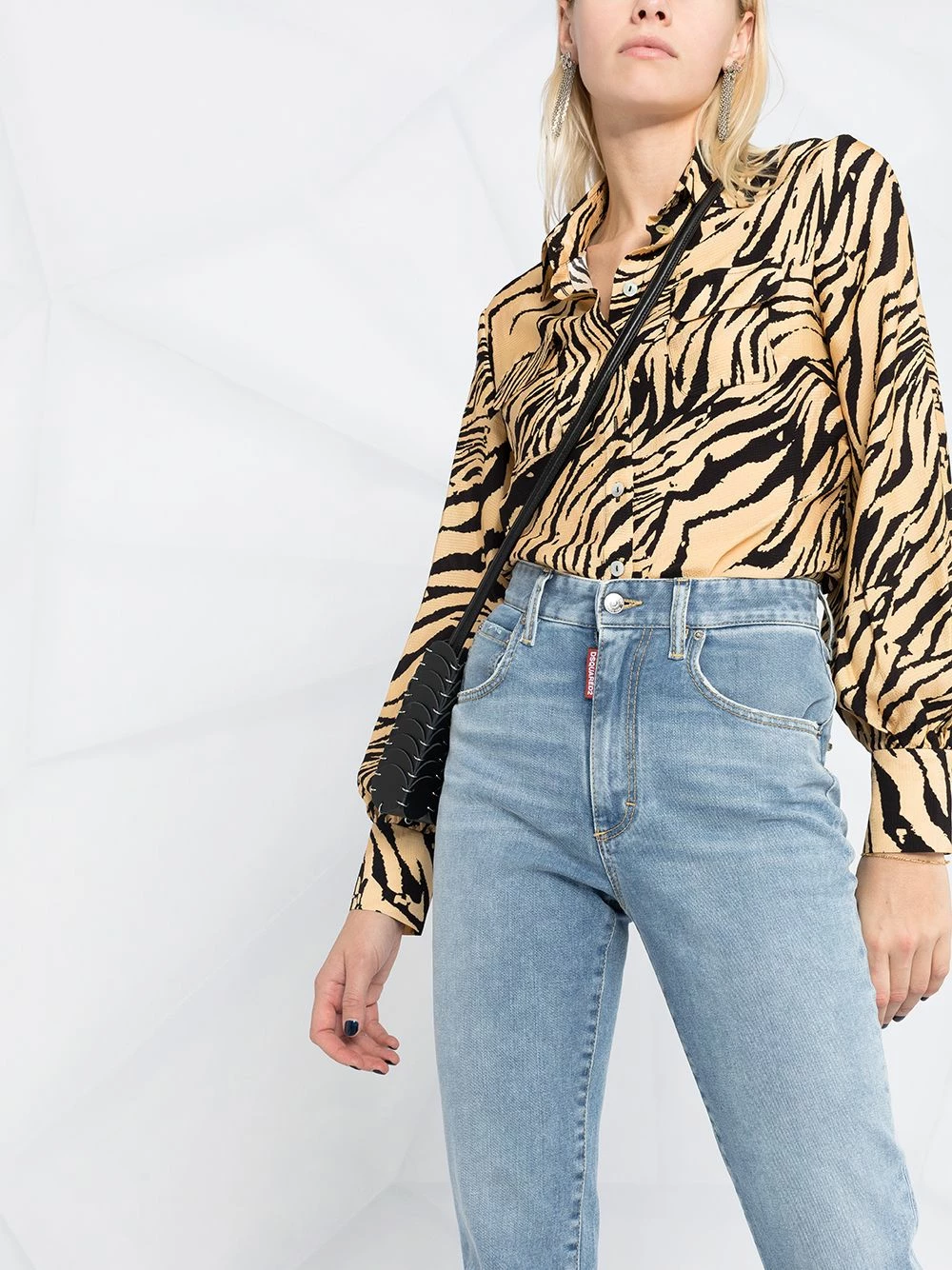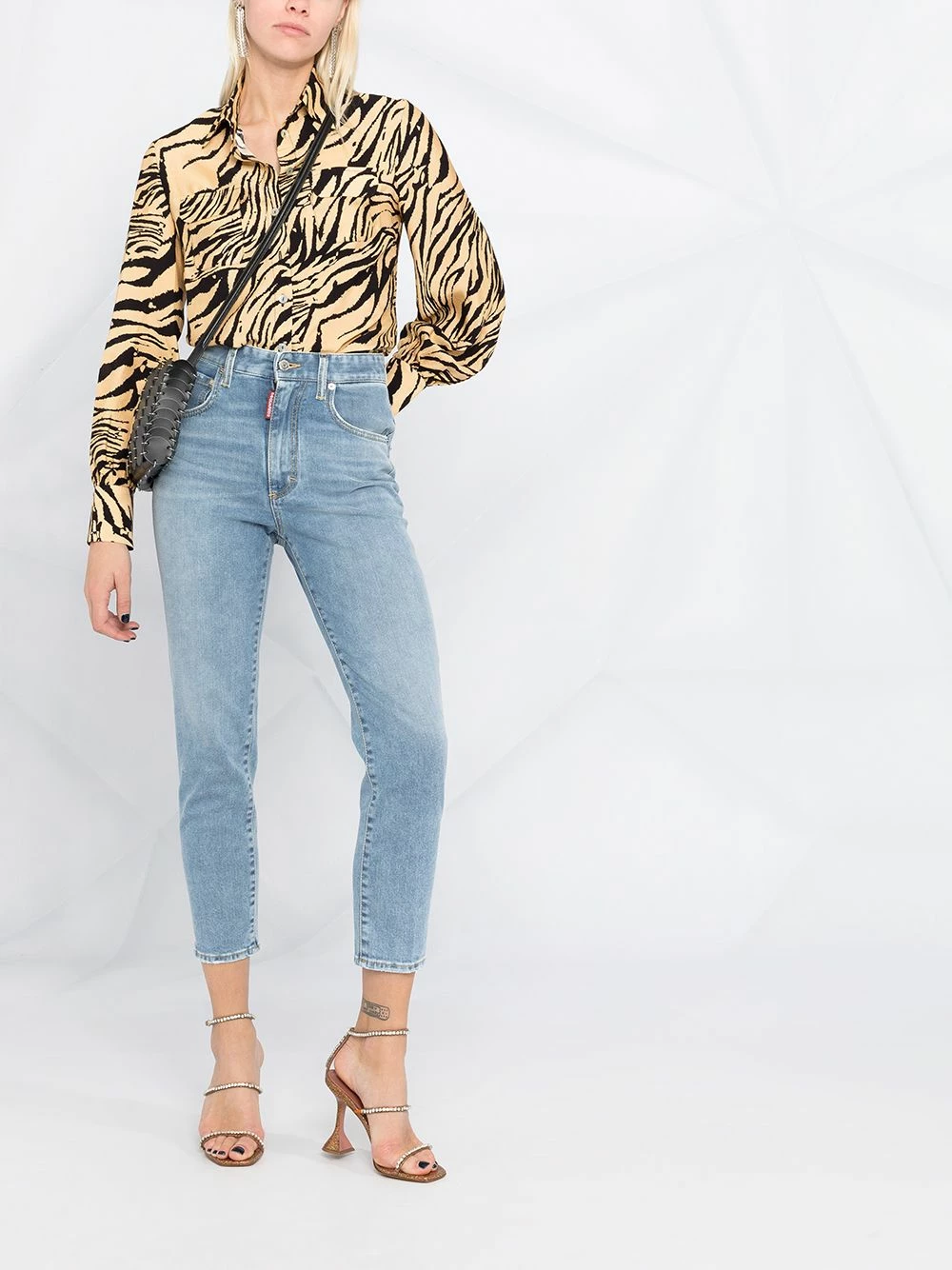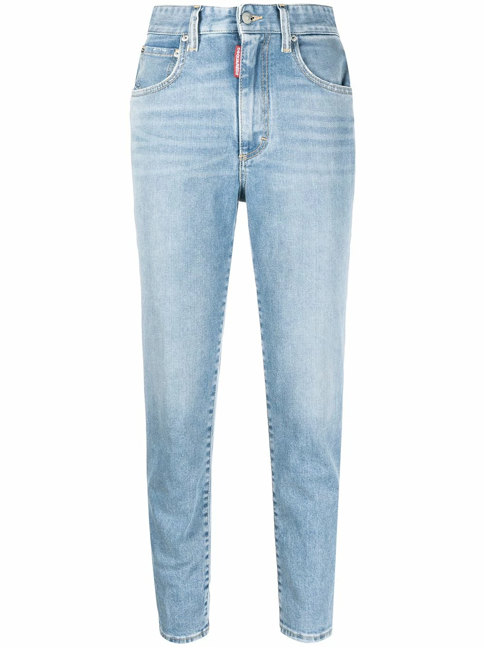 Longueur crop, effet délavé, fermeture boutonnée, passants de ceinture, 5 poches classiques, ornement en cristal. Couleur : bleu.