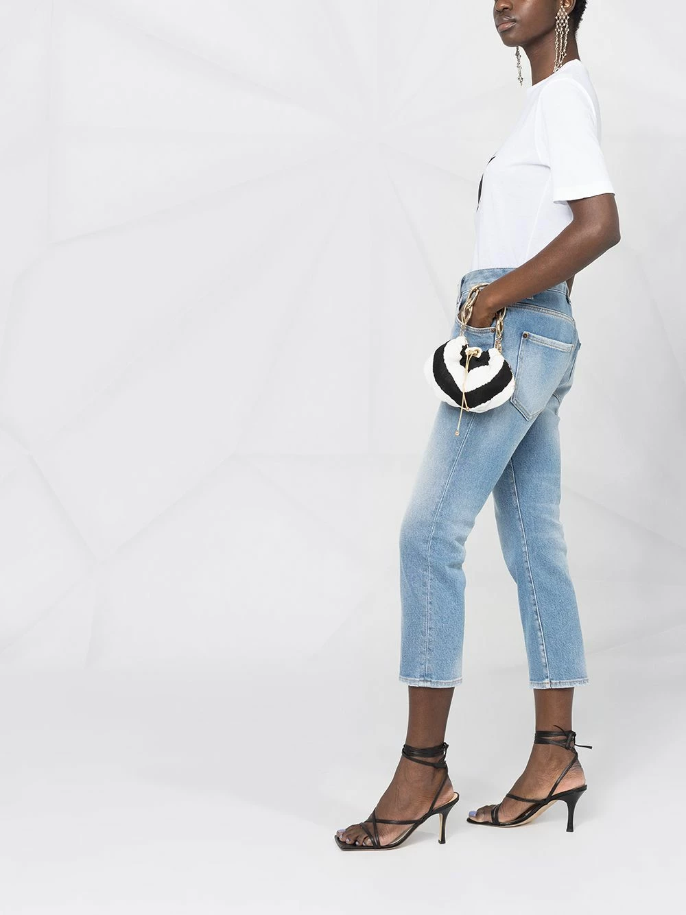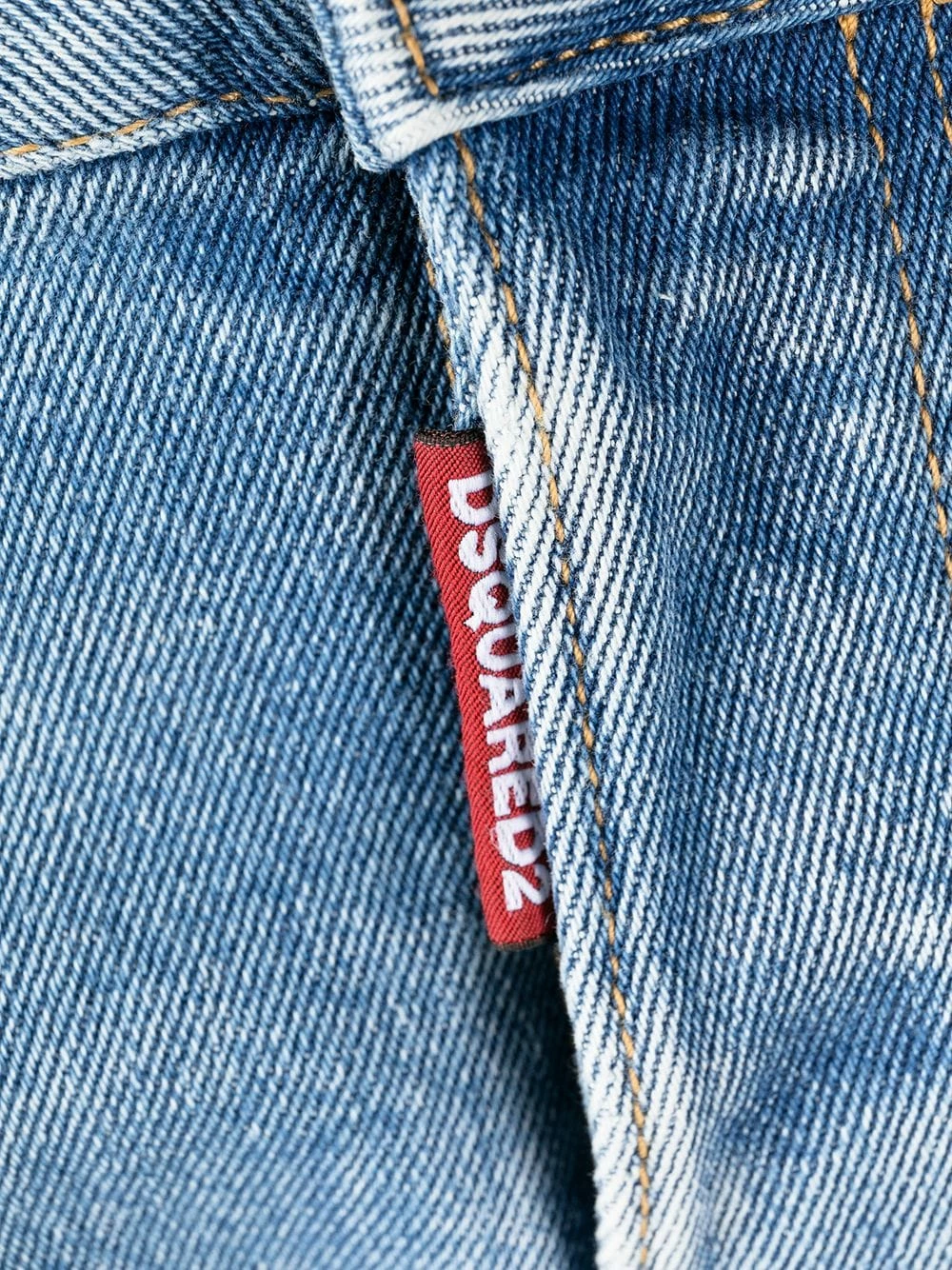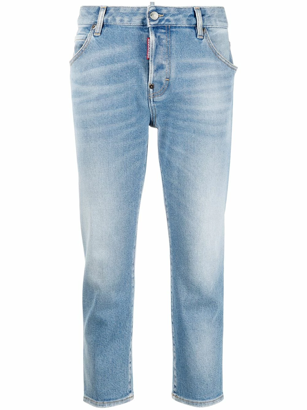 Longueur crop, effet usé, fermeture à zip et boutons sur le devant, passants de ceinture, poches latérales arrondies, patch logo sur l’arrière, poches arrière plaquées. Couleur : bleu. Matière : coton.