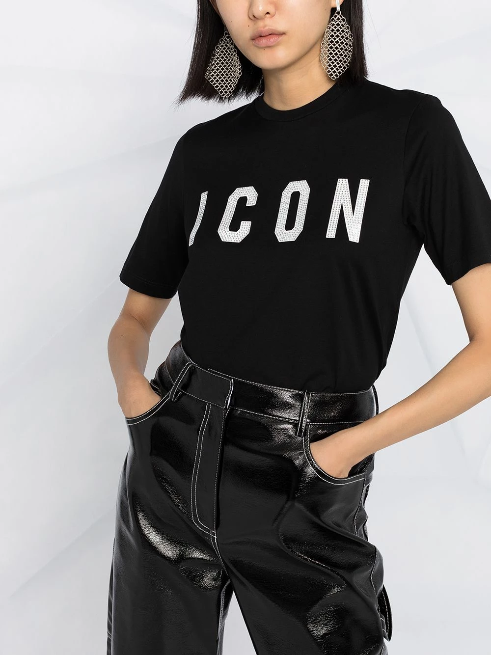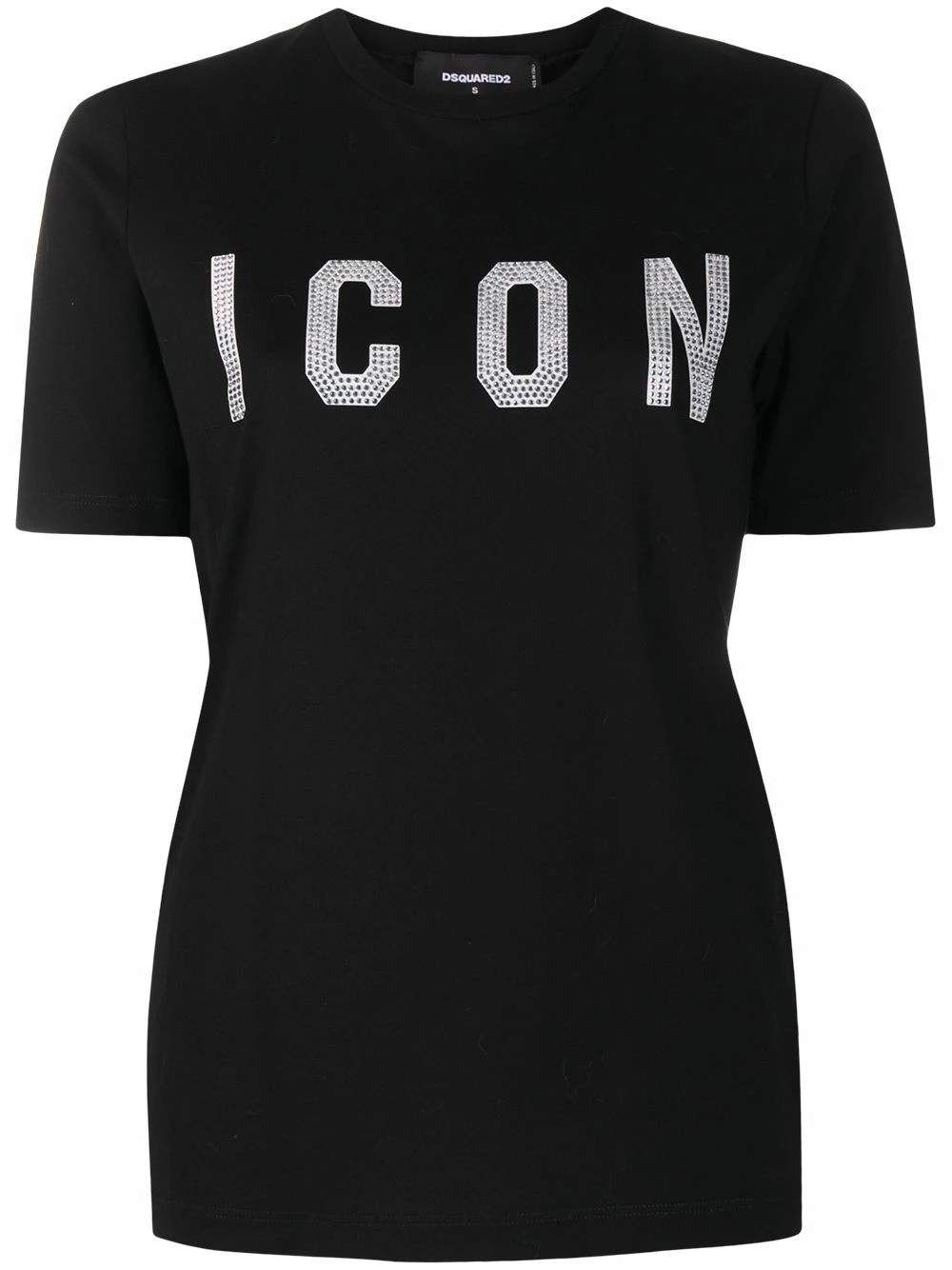 Ornement en strass, logo imprimé à la poitrine, manches courtes, encolure ronde, ourlet droit. Couleur : noir. Matière : coton.