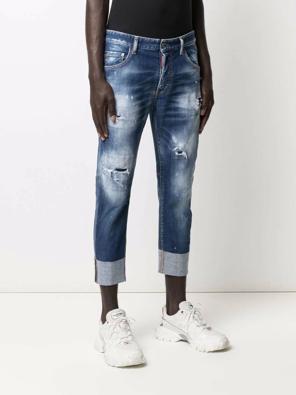 Patch logo sur l’arrière, finitions effilochées, effet usé, taille mi-haute, passants de ceinture, boutonnière sur le devant, cinq poches classiques, longueur crop. Couleur : bleu.