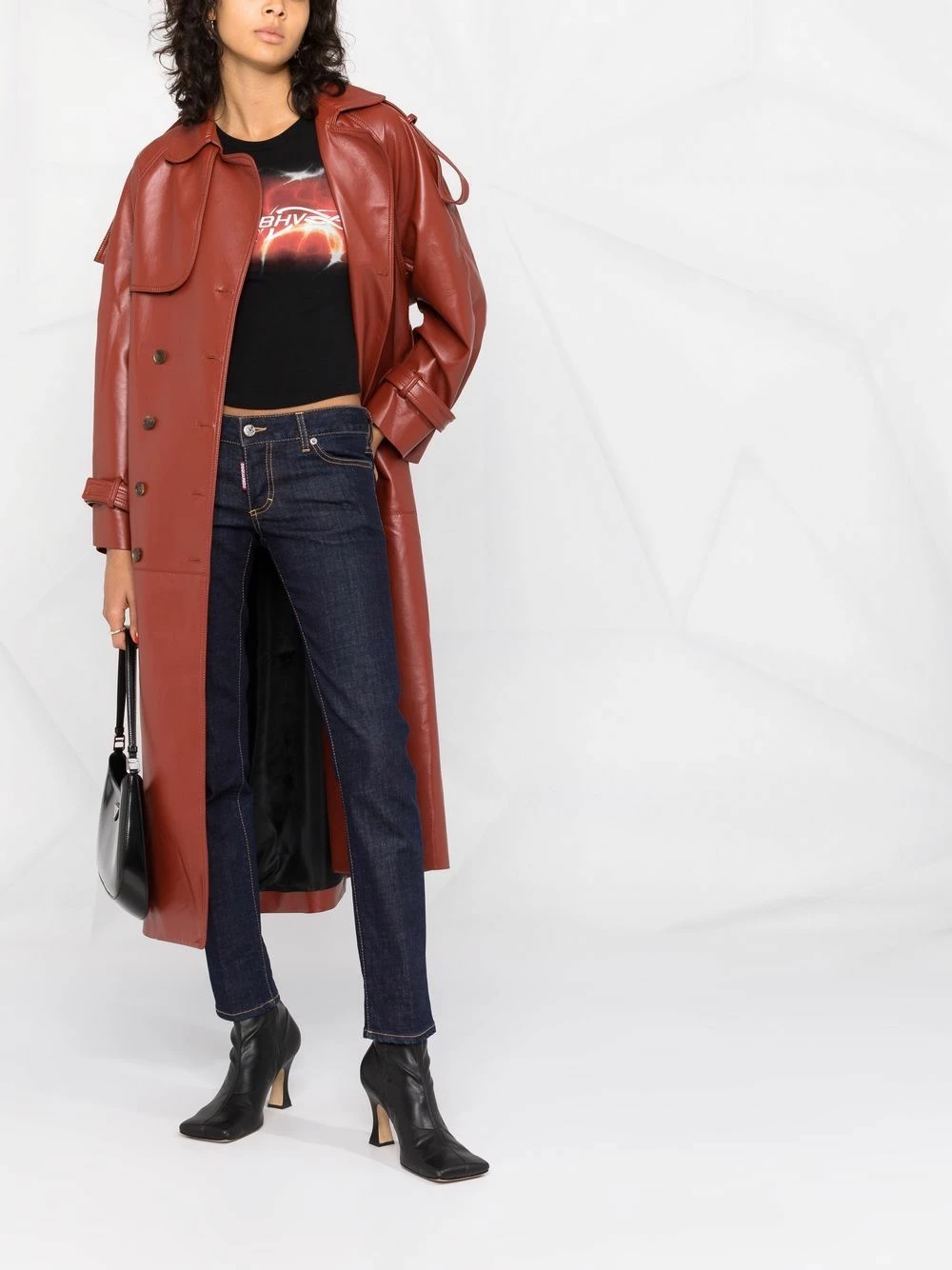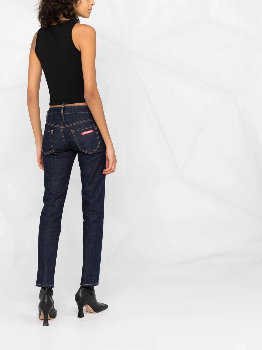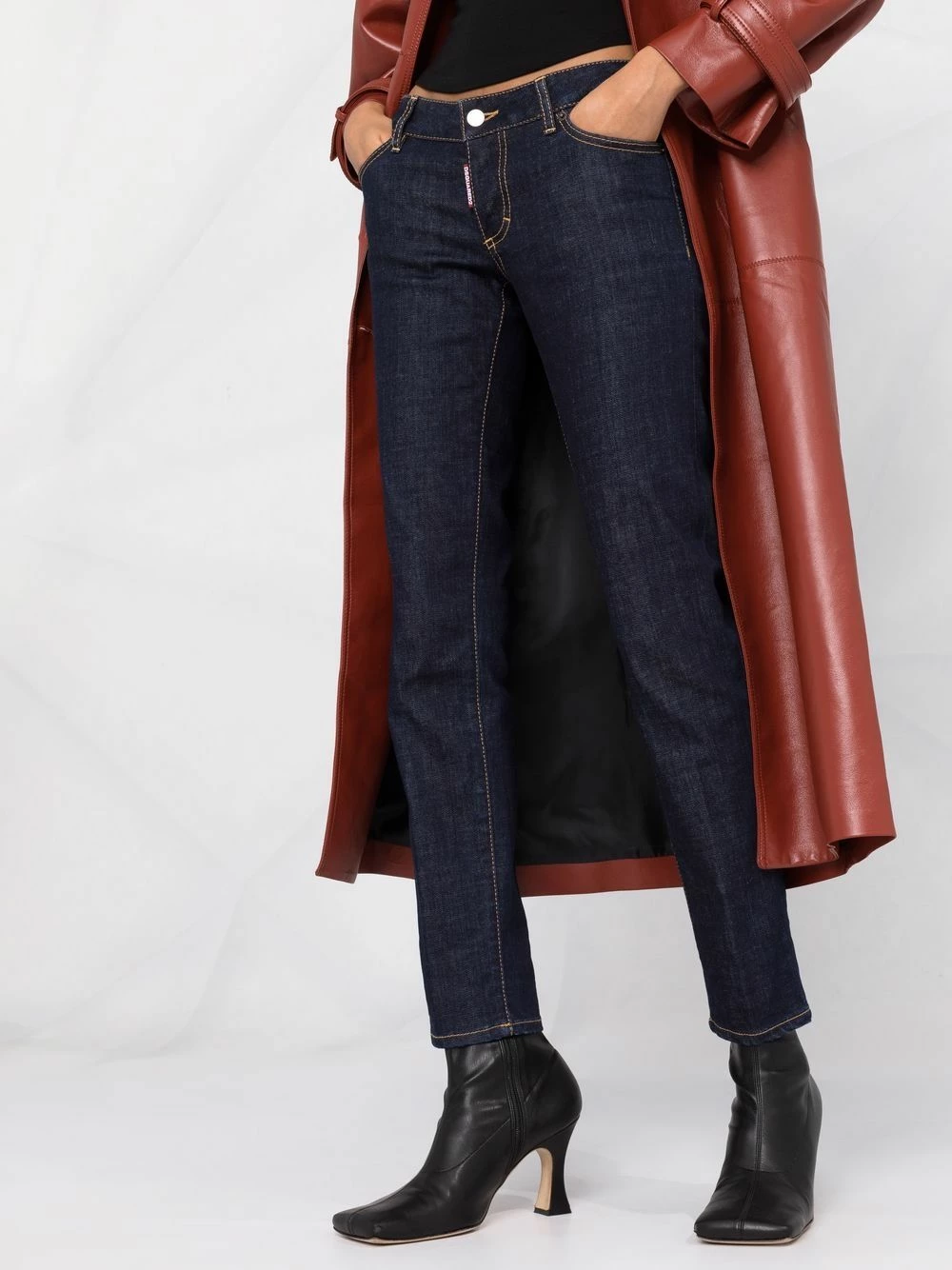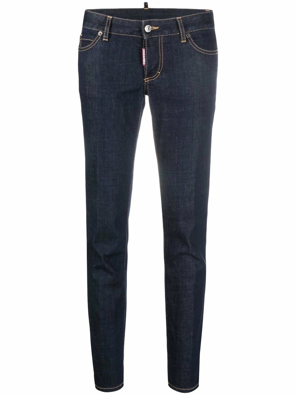Étiquette logo, passants de ceinture, cinq poches classiques, coupe skinny. Couleur : bleu.