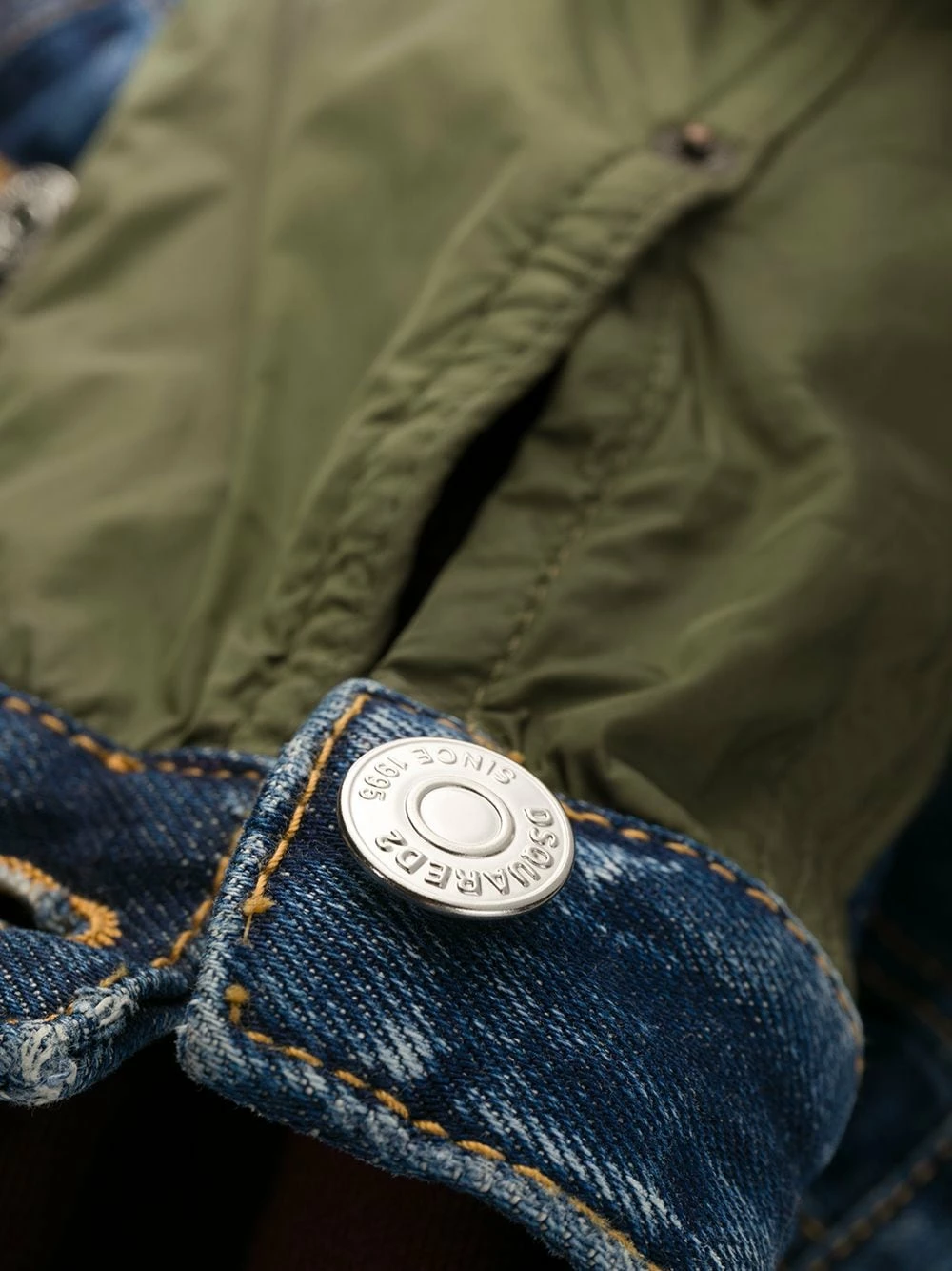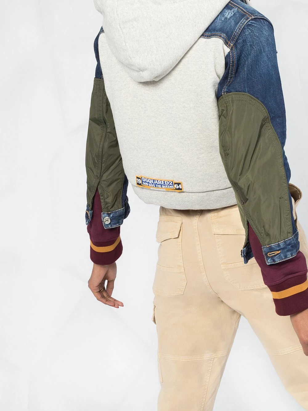 Manteau en jean à capuche en coton mélangé Dsquared2 avec fermeture zippée à double sens, design superposé, empiècements contrastants et manches longues. Couleur : bleu.