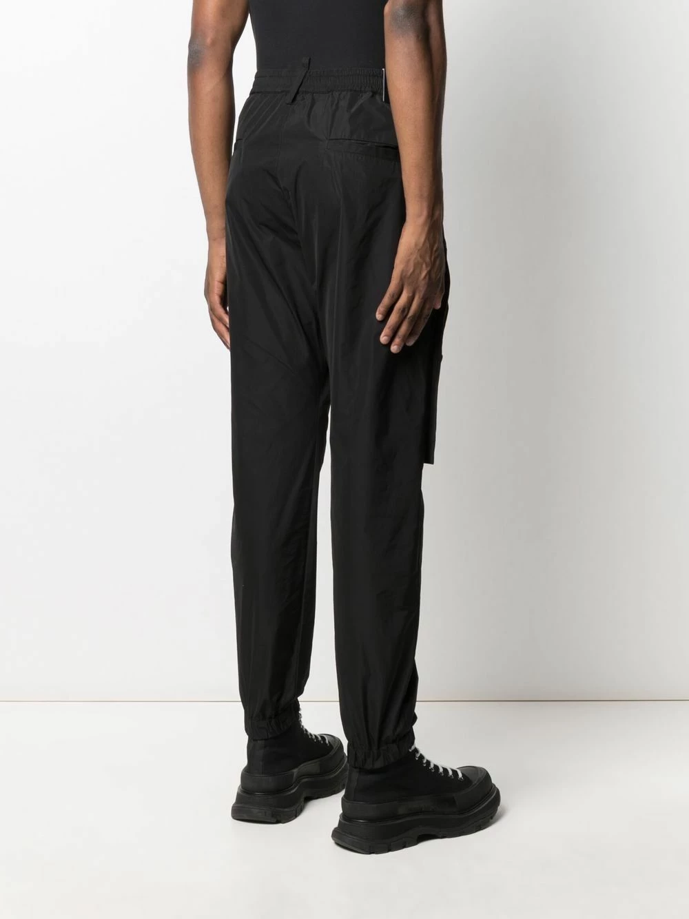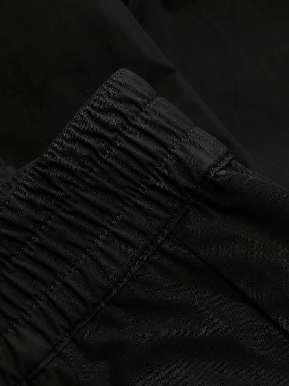 Patch logo sur le côté, fermeture duffle-coat sur le devant, ornements argentés, deux poches latérales zippées, poches arrière passepoilées, chevilles élastiques. Couleur : noir.