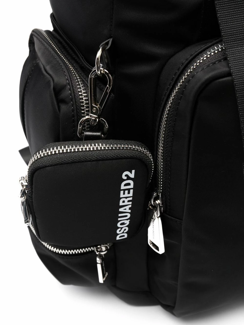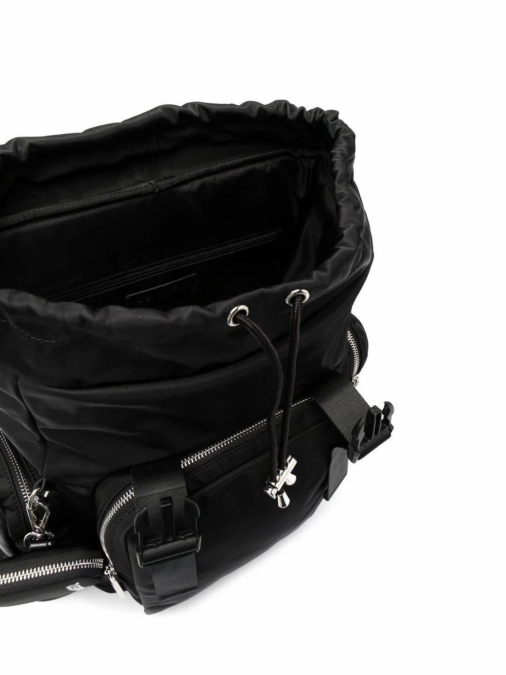 Logo imprimé et orné, patch logo sur le devant, ornements argentés, compartiment principal, poches multiples zippées, lien de resserrage, rabat sur le dessus, fermeture à boucle coulissante, anse classique, brides porté épaule ajustables. Couleur : noir.