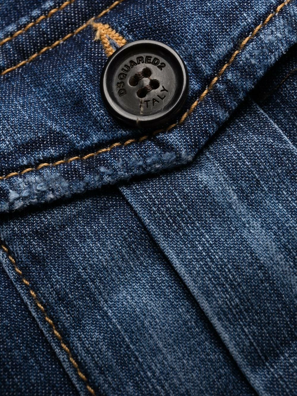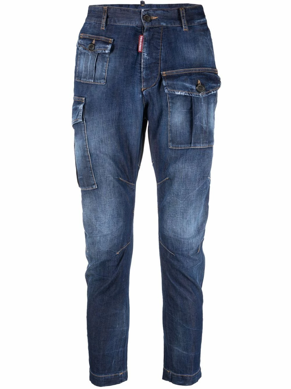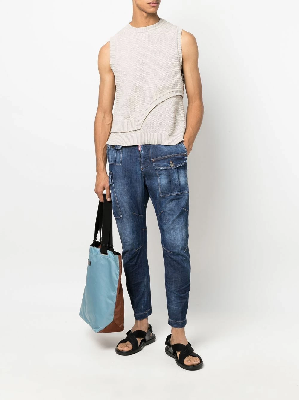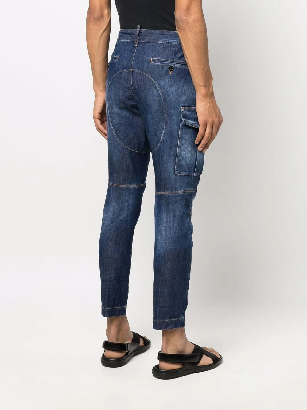 Teinture foncée, taille basse, coupe slim, poches cargo multiples.