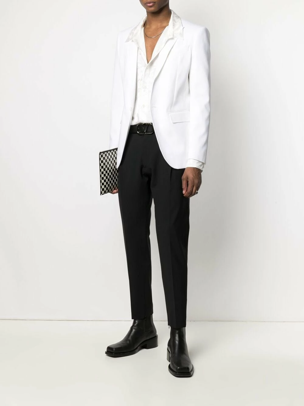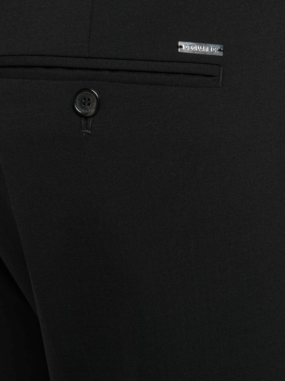 Coupe fuselée, passants de ceinture, fermeture à zip et agrafes, poches latérales fendues, chevilles zippées, deux poches arrières boutonnées. Couleur : noir.