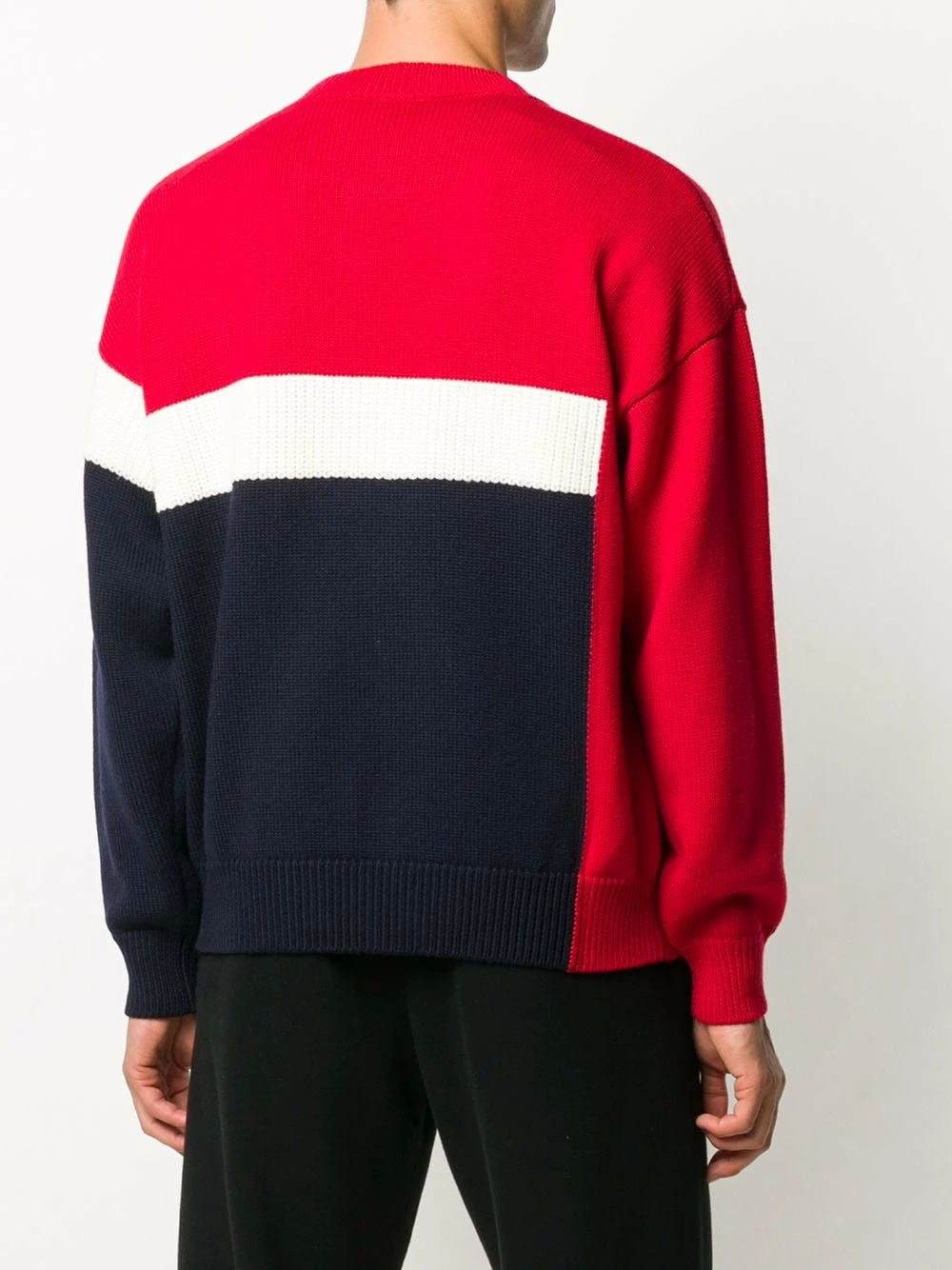 Encolure ras du cou, effet d’épaules descendues, manches longues, poignets nervurés, design à empiècements colour block, ourlet nervuré. Matière : laine.