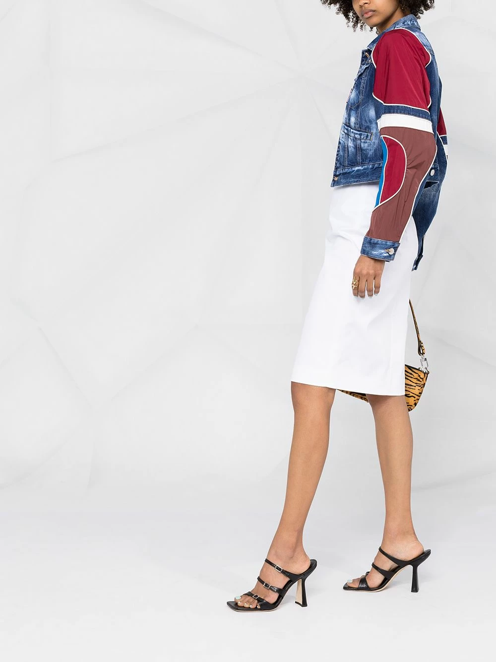 Col classique, boutonnière sur le devant, poches poitrine à rabat, finitions à effet usé, manches à tissu contrastant, deux poches latérales passepoilées, coupe courte.