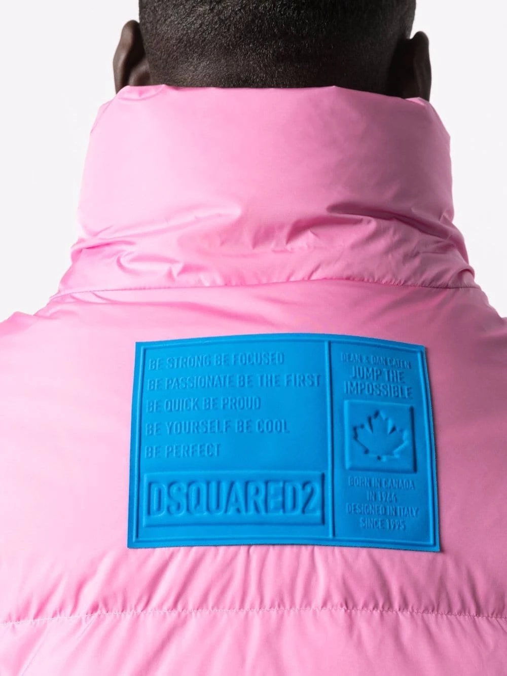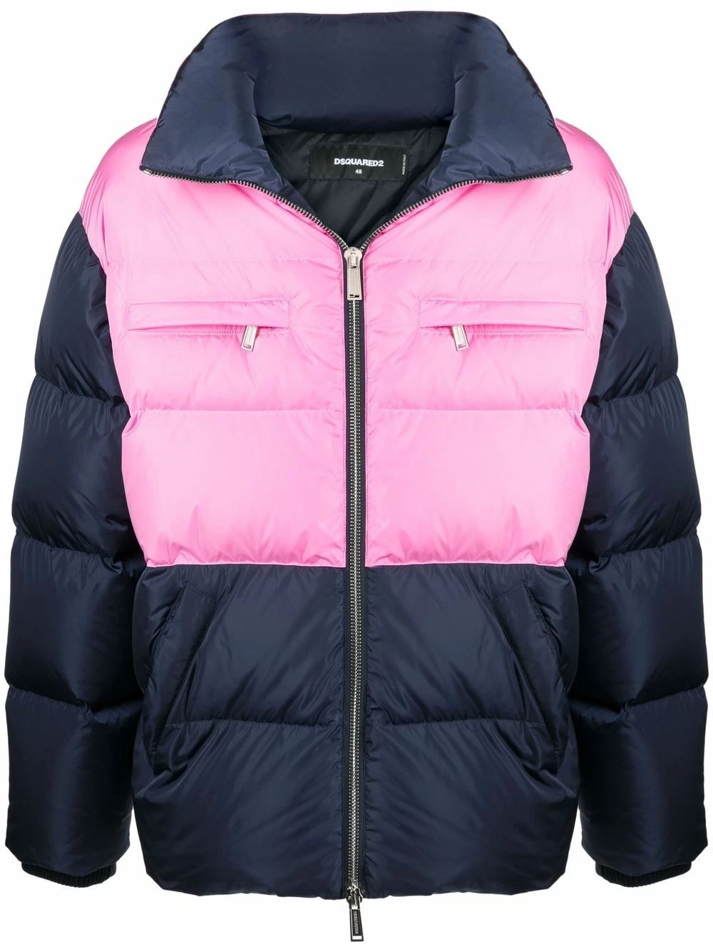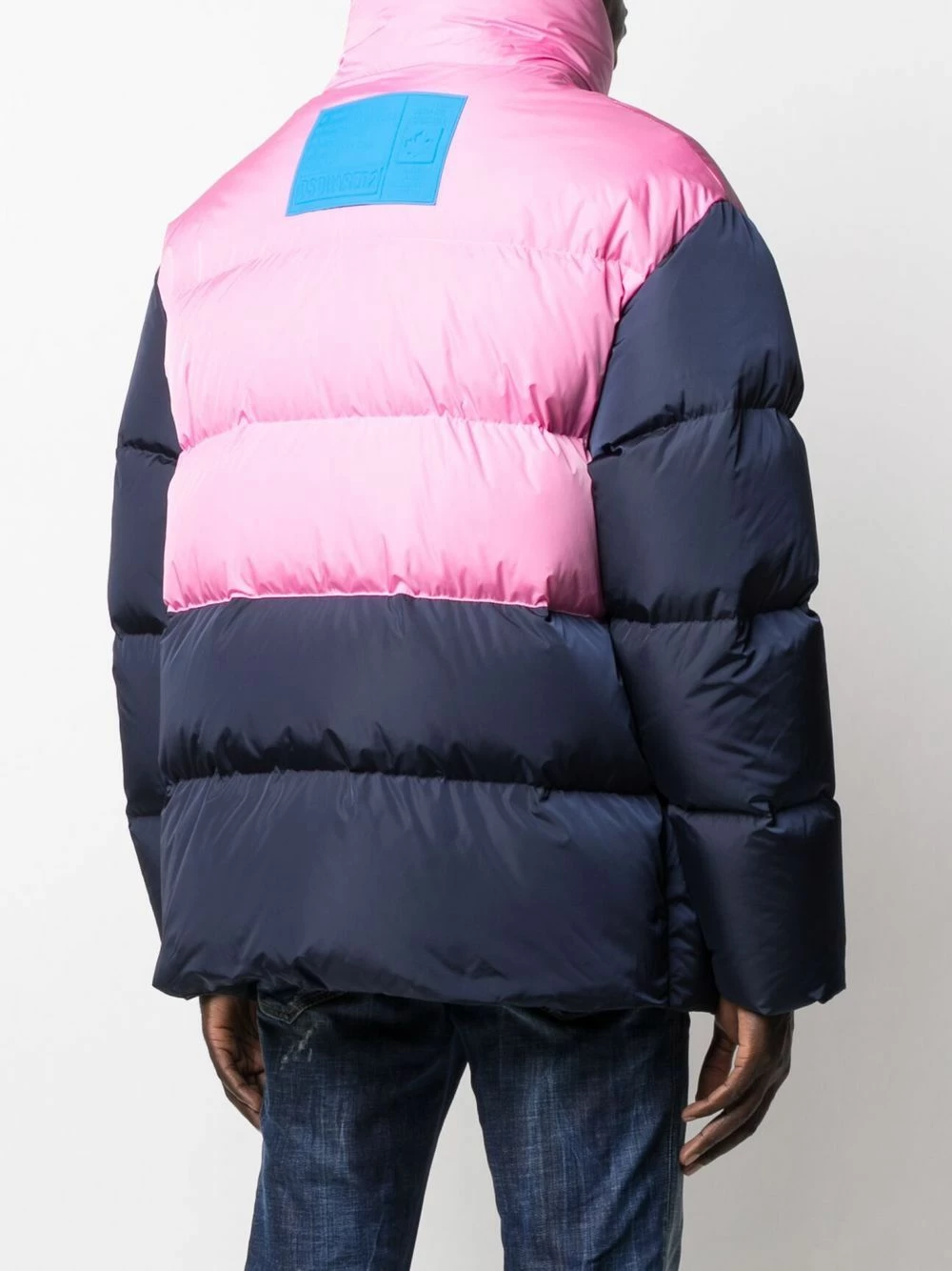 Patch logo sur l’arrière, empiècements contrastants, design matelassé, col cheminée, manches longues, deux poches zippées, fermeture zippée devant, deux poches latérales fendues.