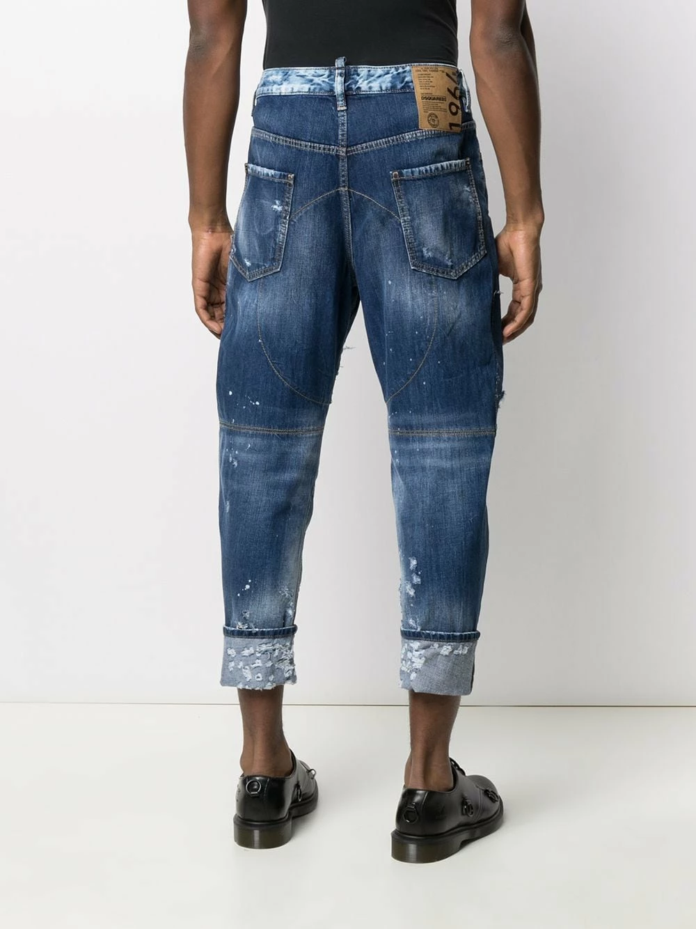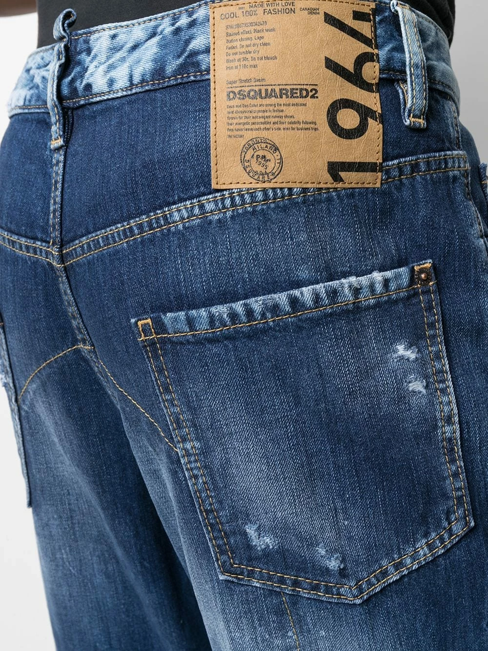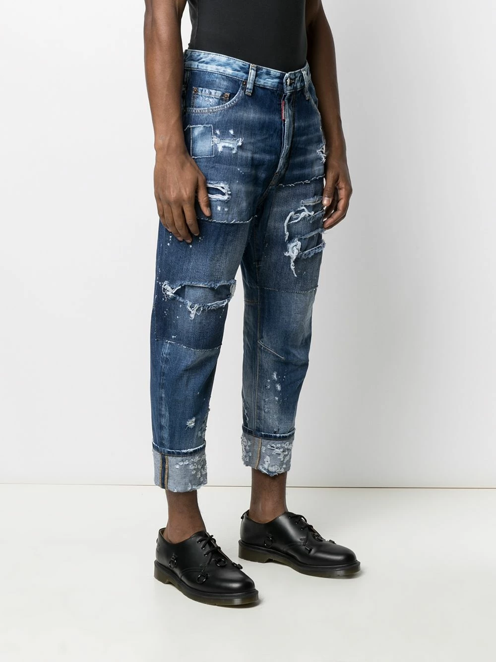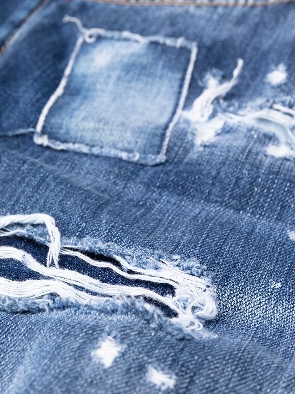 Effet délavé, design patchwork, finitions effilochées, passants de ceinture, taille haute, boutonnière sur le devant, patch logo sur le devant, 5 poches classiques, patch logo sur l’arrière, coupe droite, ourlet retroussé, coupe courte. Couleur : bleu. Matière : denim de coton.