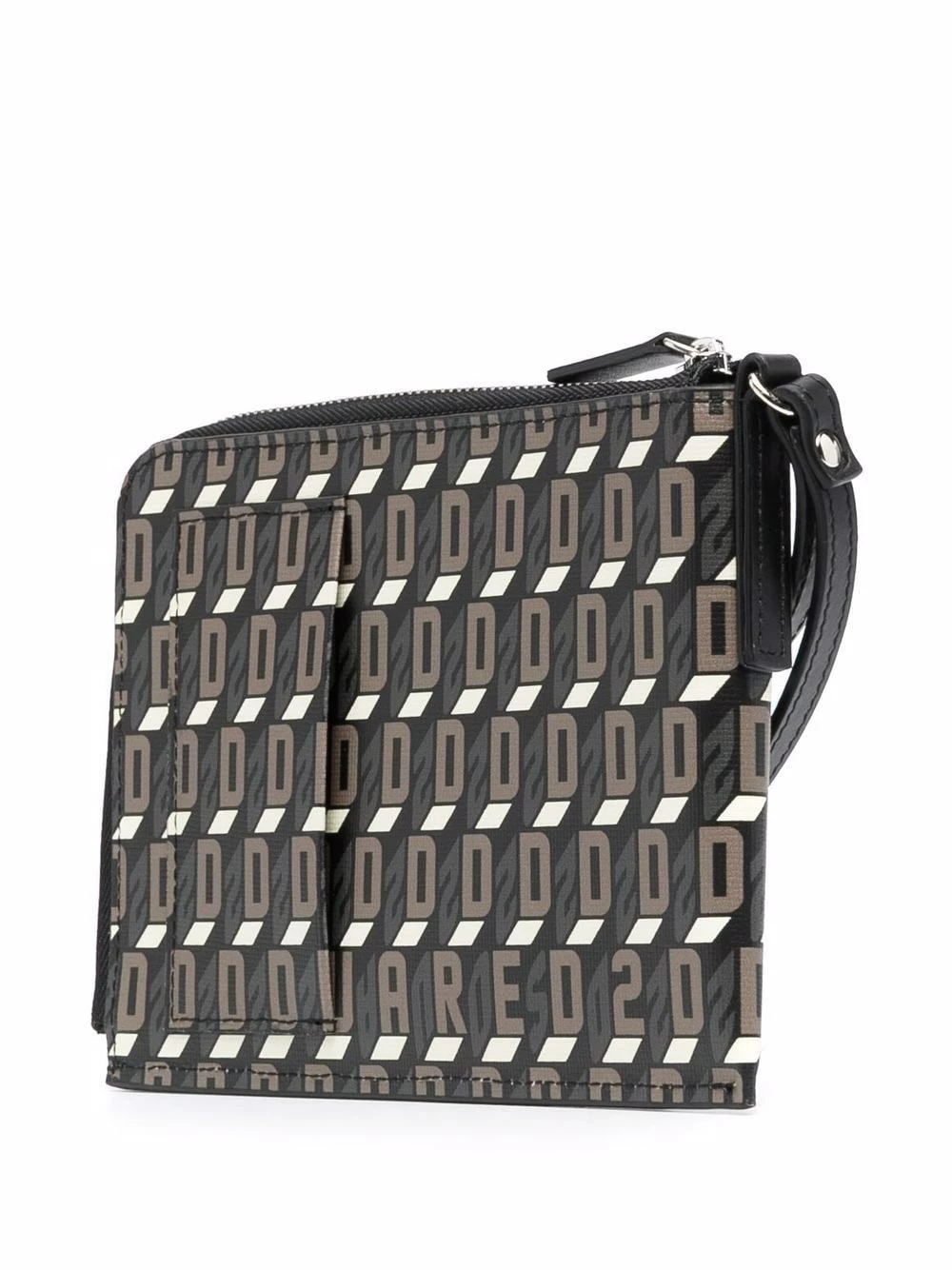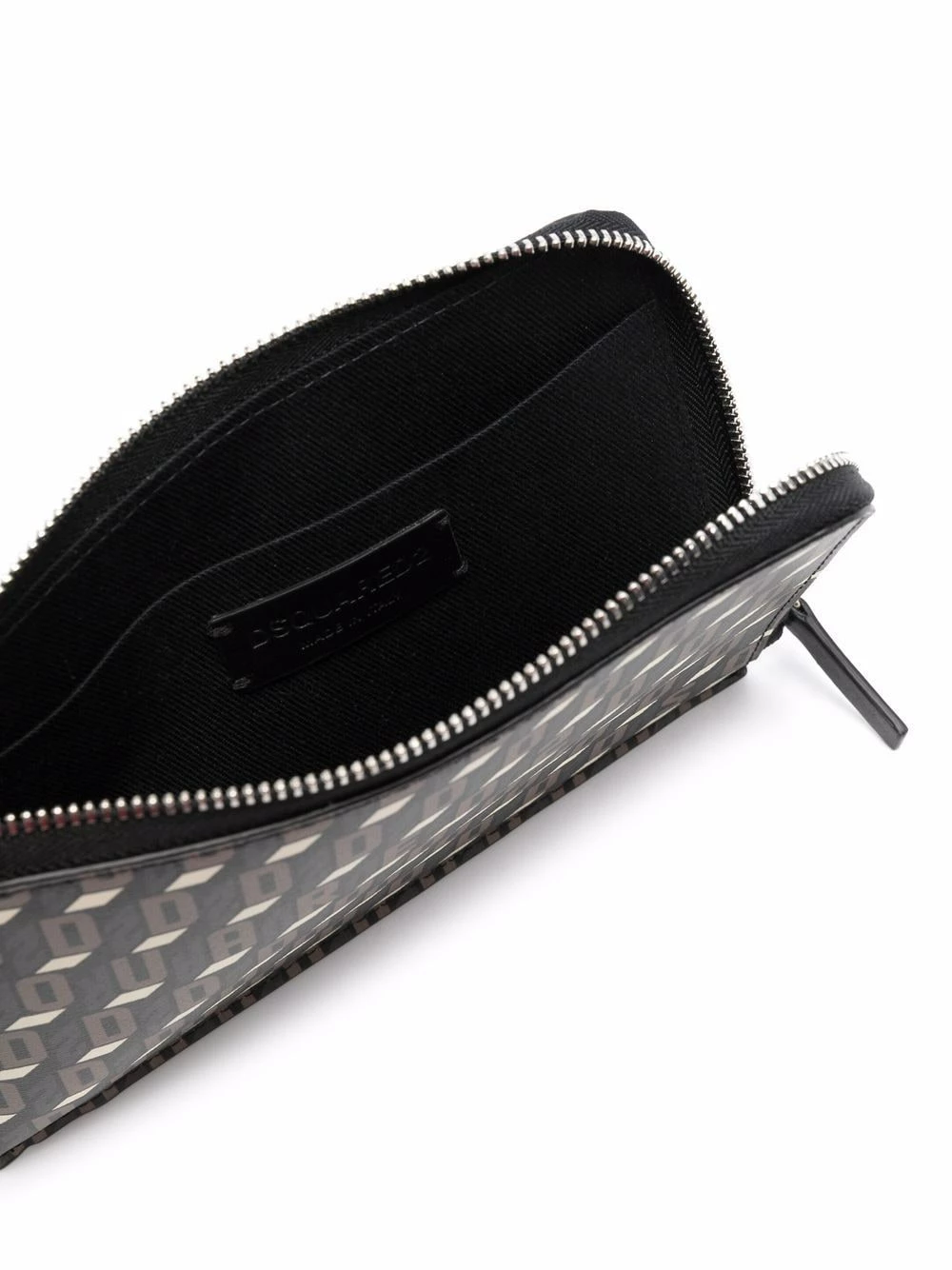 Fini texturé, motif monogrammé, fermeture zippée tout autour, bride porté poignet, poche plaquée à l’arrière, doublure intégrale, patch logo intérieur, poche intérieure plaquée. Couleur : noir. Matière : cuir.