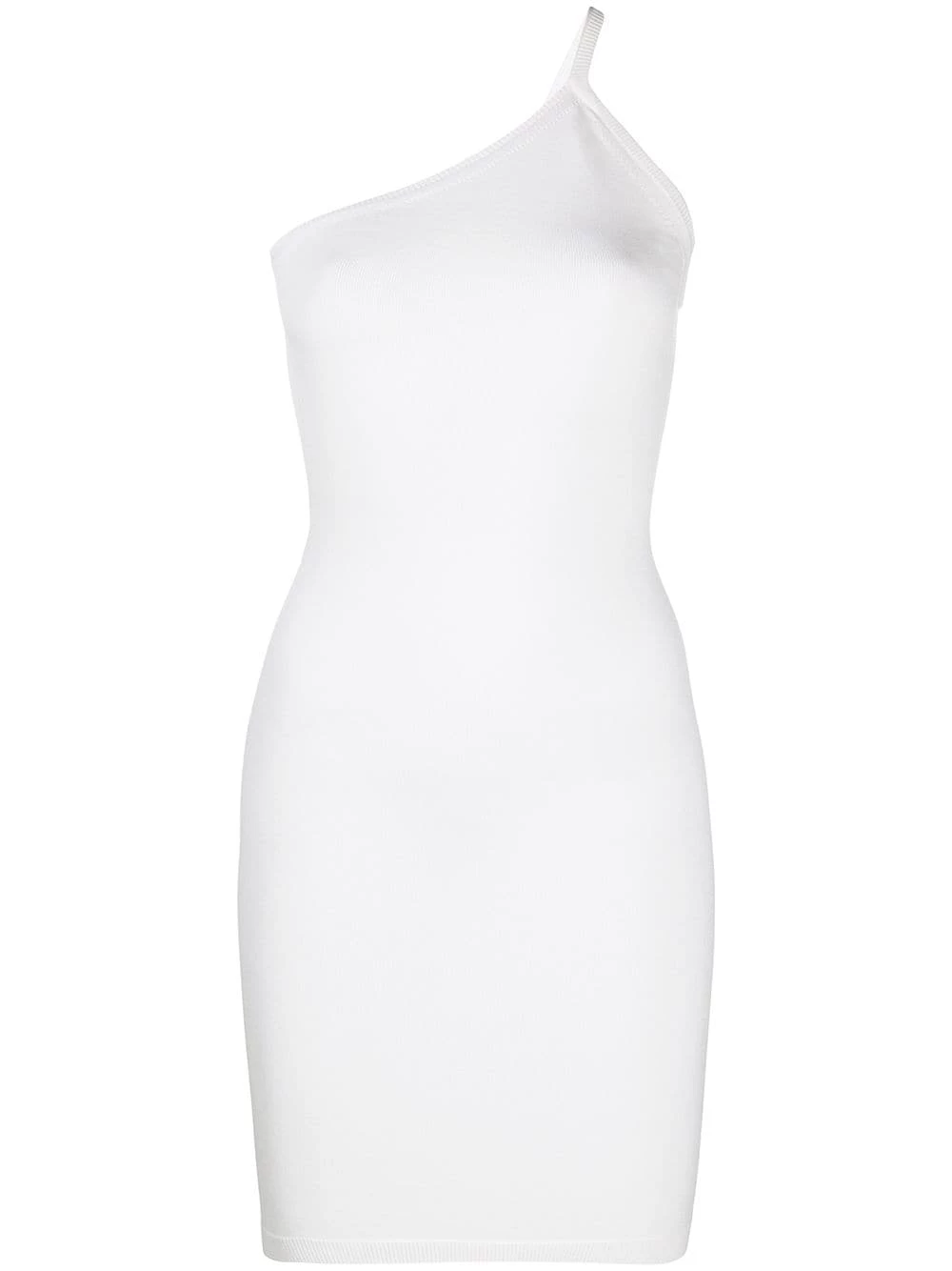 Design asymétrique à une épaule, fines bretelles, design moulant, design tricoté, coupe courte. Couleur : blanc. Matière : coton.
