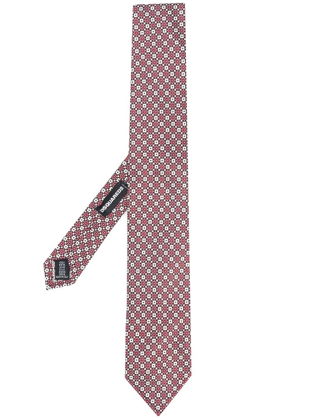 Cravate en soie blanche et bordeaux à motif géométrique Dsquared2 avec design en pointe et taille ajustable.