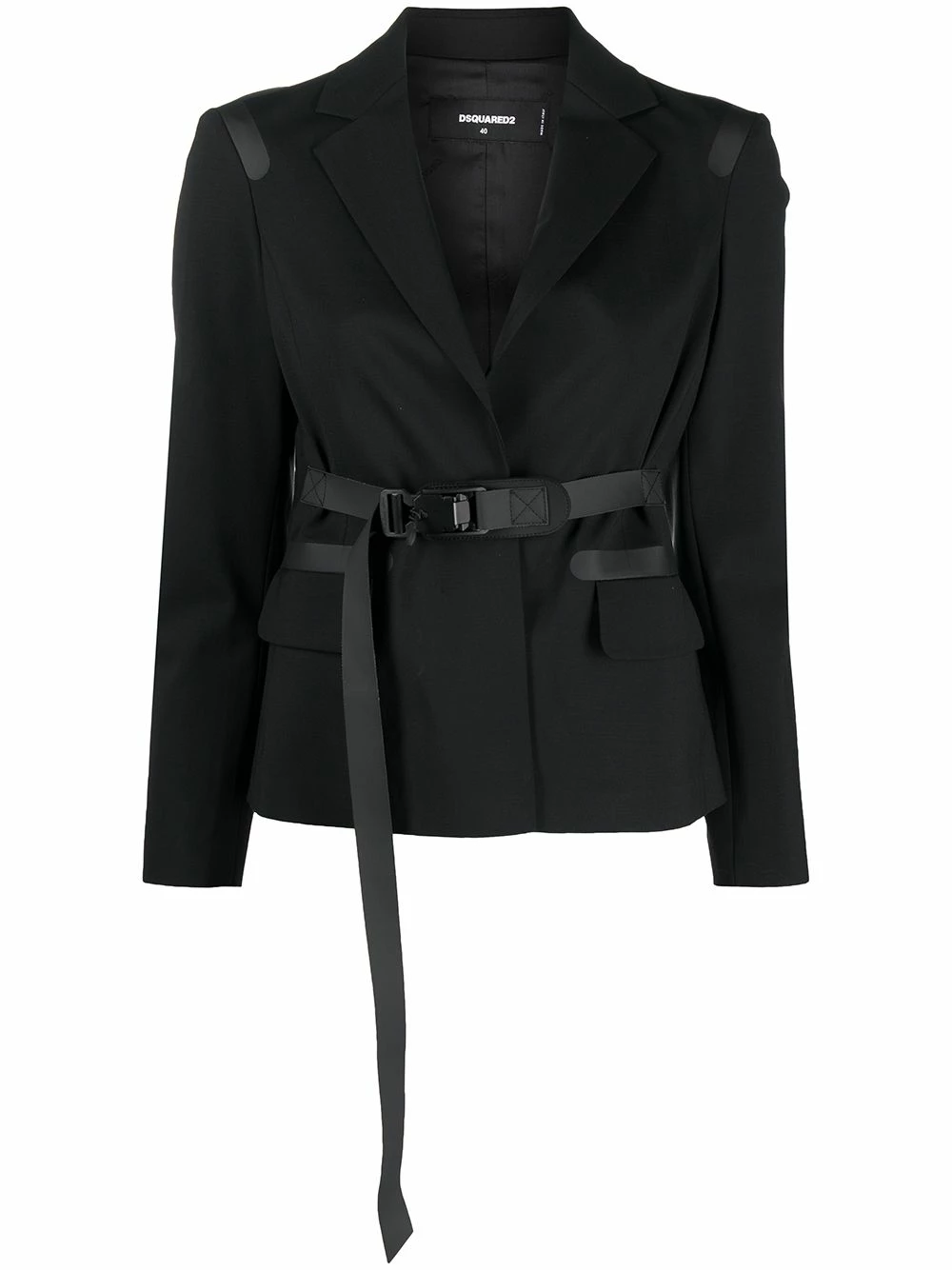 Design à empiècements, revers crantés, taille ceinturée, fermeture à boucle, manches longues, poches latérales à rabat, fente arrière. Couleur : noir.