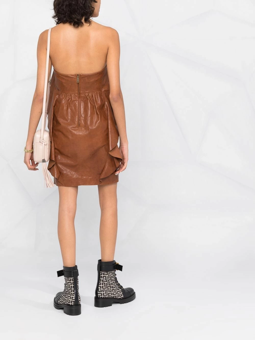 Sans bretelles, bord volanté, fermeture zippée dissimulée à l’arrière, coutures ton sur ton, doublure intégrale, ourlet incurvé. Couleur : marron.