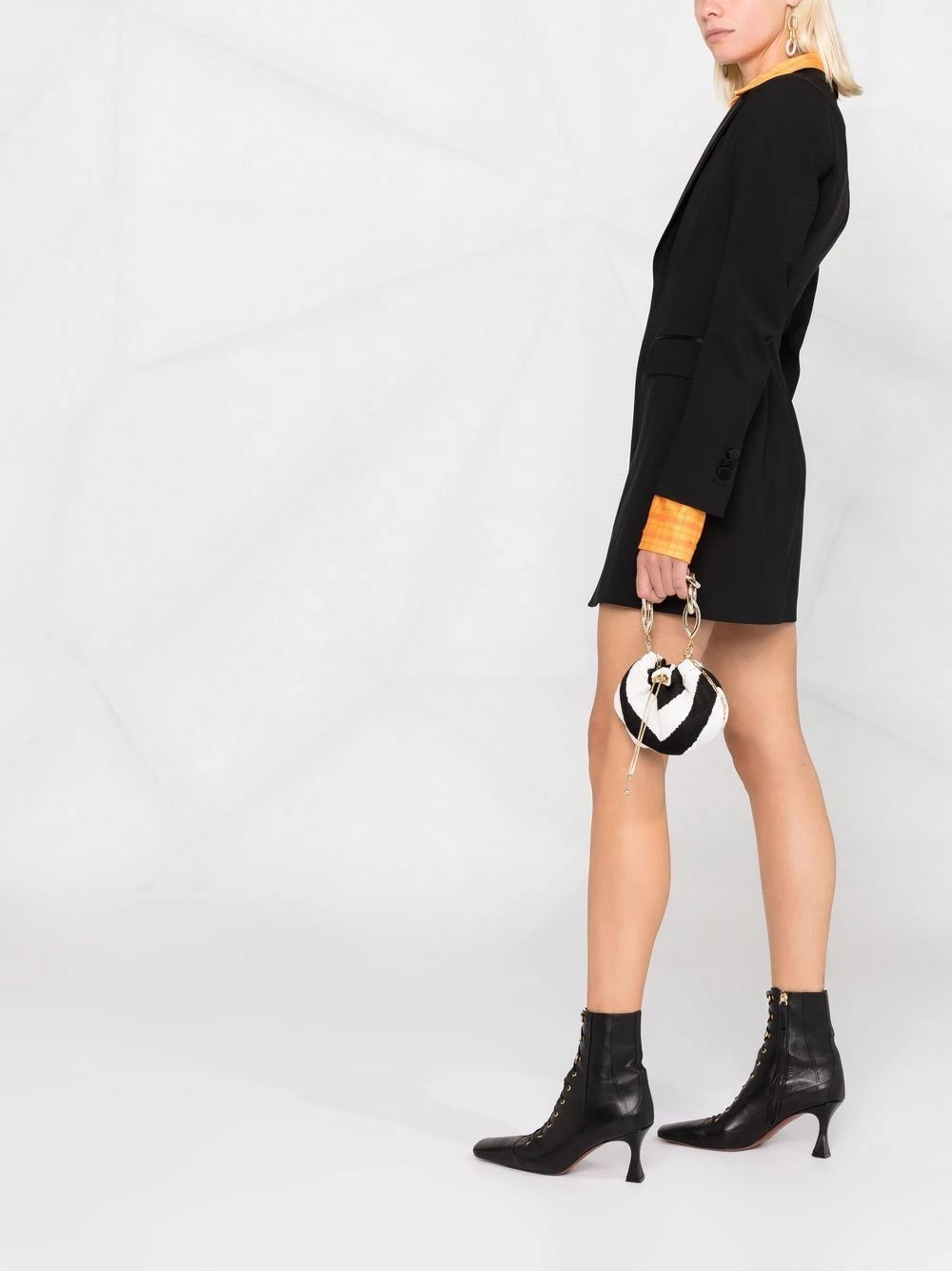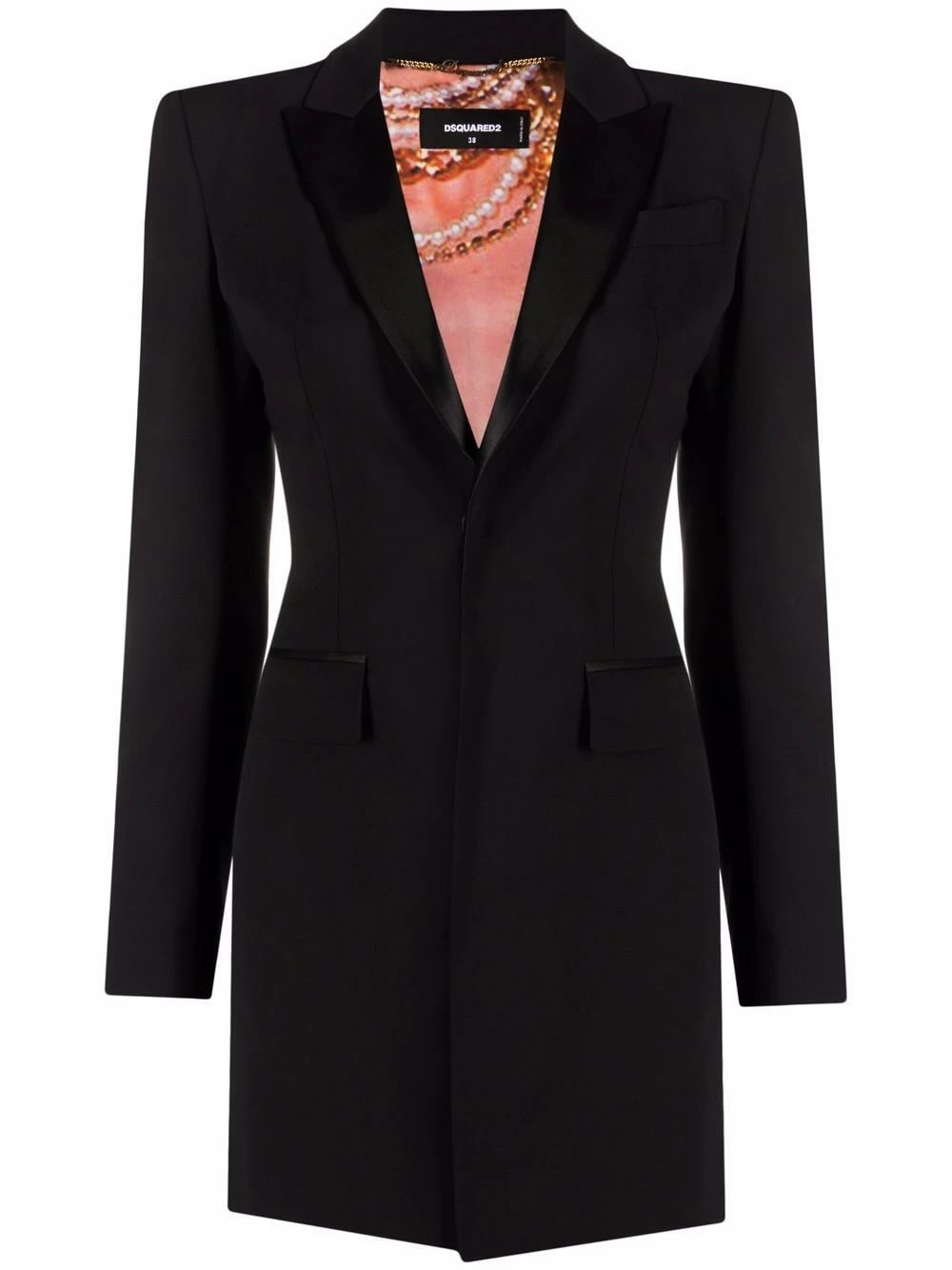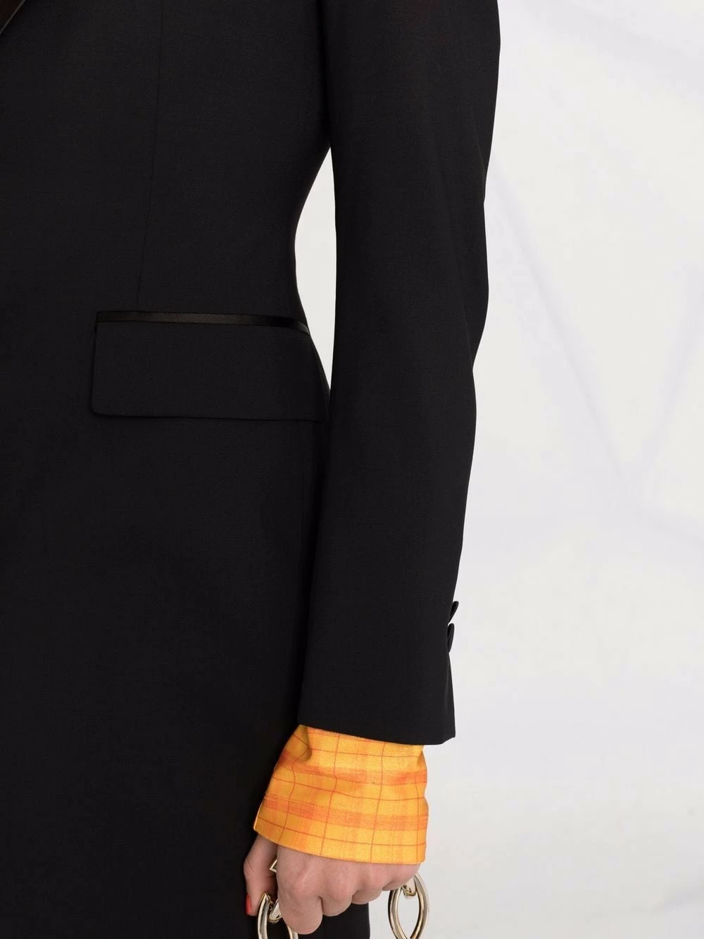 Coupe classique, revers pointus, col v, fermeture dissimulée sur le devant, manches longues, poignets boutonnés, poche passepoilée sur la poitrine, deux poches à rabat sur le devant, ourlet droit. Couleur : noir.