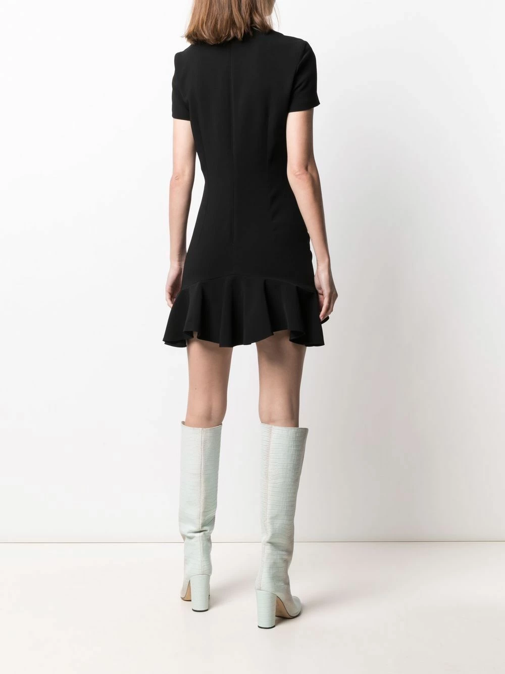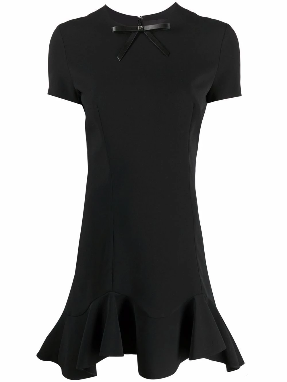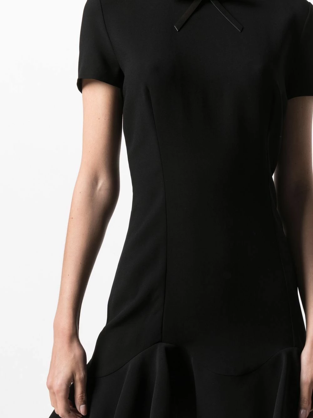 Détail de nœud, encolure ronde, manches courtes raglan, coutures ton sur ton, ourlet péplum, fermeture zippée à l’arrière. Couleur : noir.