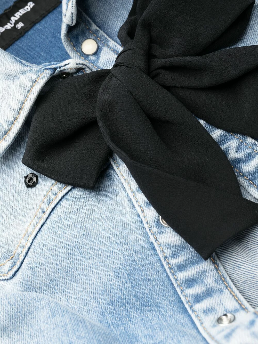 Col classique, boutonnière sur le devant, détail de nœud, passants de ceinture, manches longues, poignets boutonnés, coupe courte. Couleur : bleu.