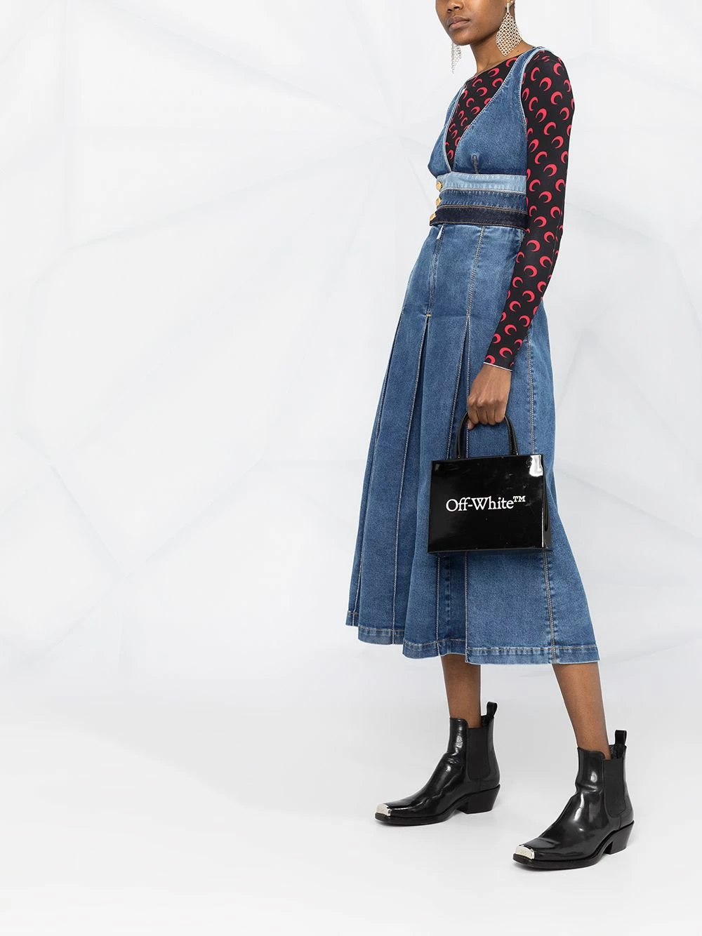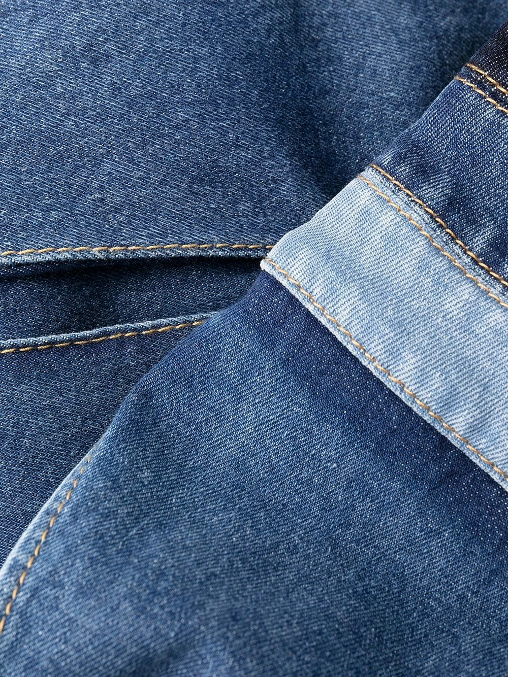 Col v profond, boutonnière sur le devant, fermeture zippée devant, deux poches latérales passepoilées, plis creux, ourlet évasé. Couleur : Bleu.