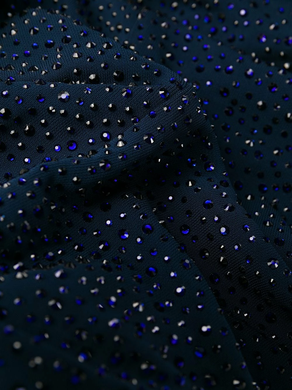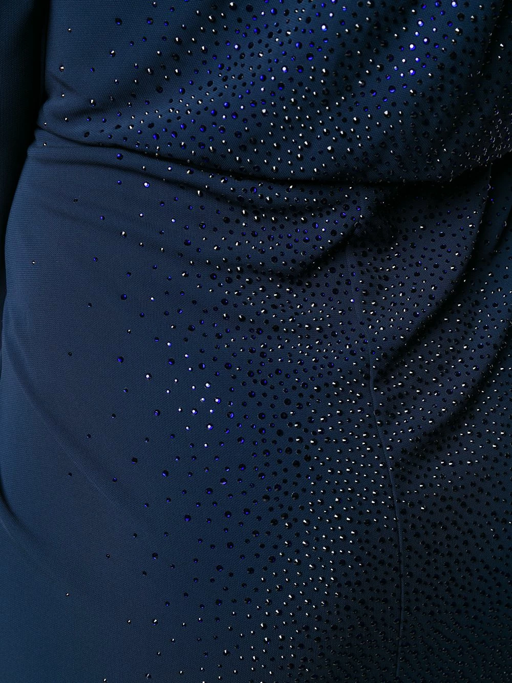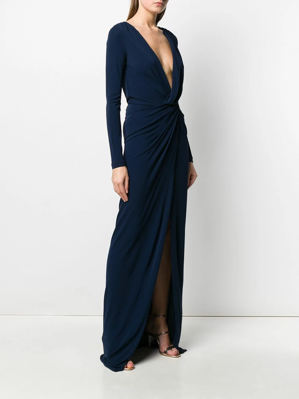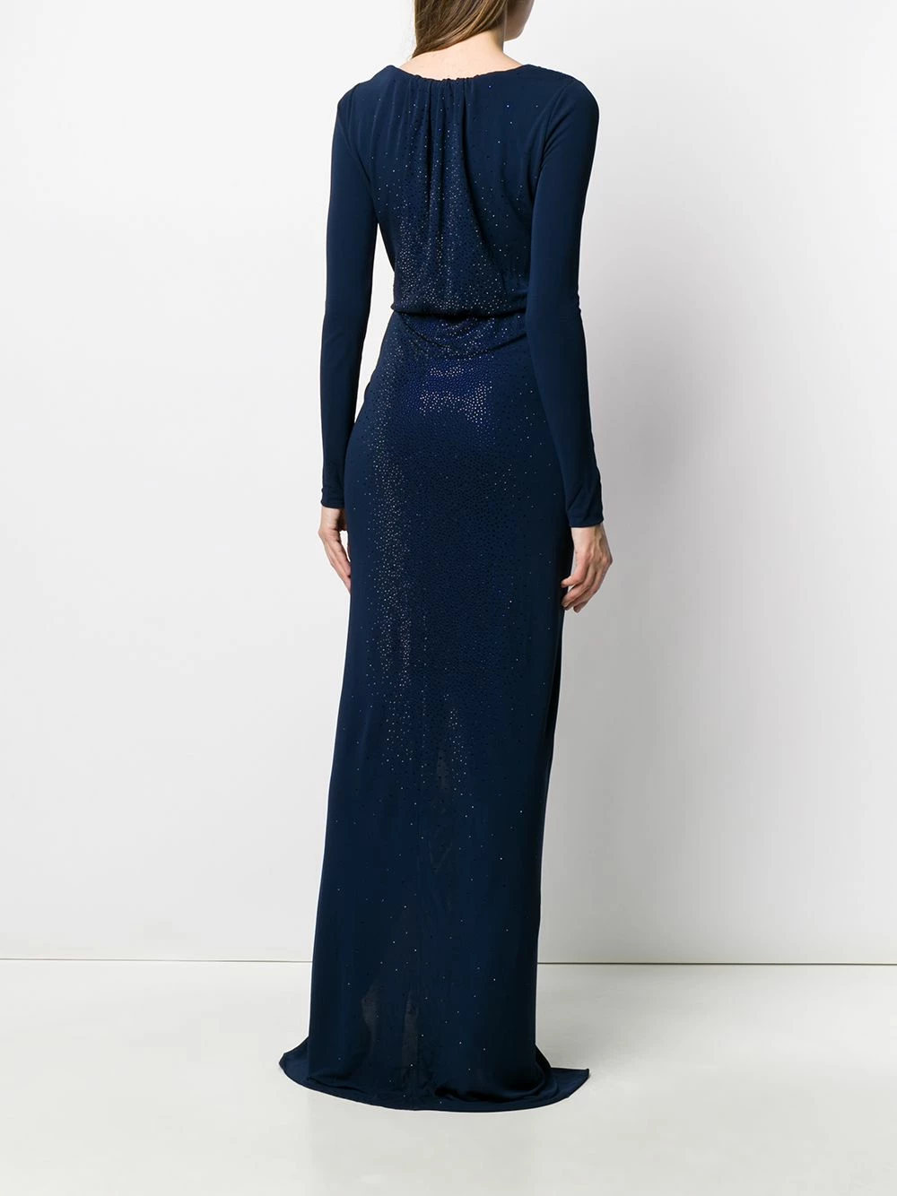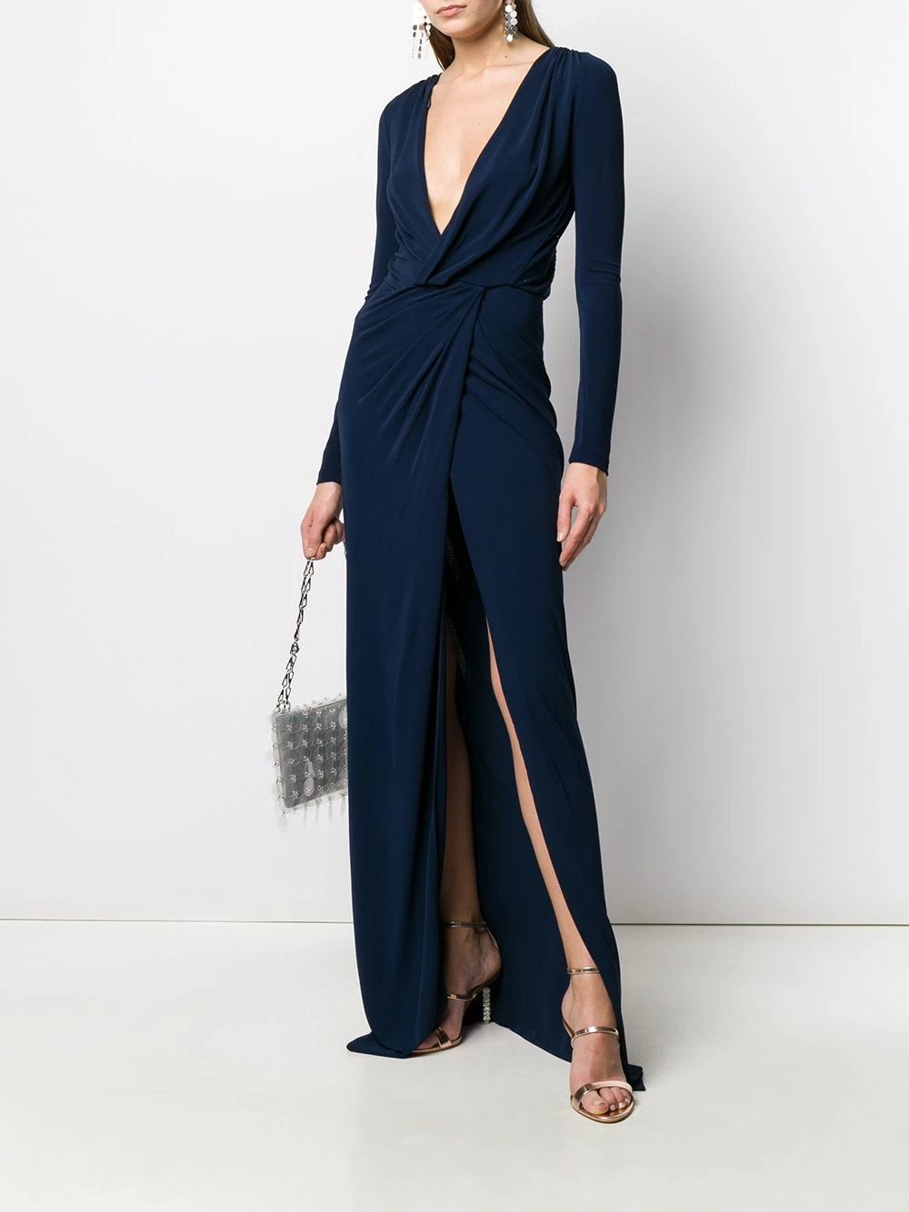 Robe longue à taille froncée Dsquared2 avec col v profond, manches longues, torsion centrale, détails drapés, fente latérale et design strassé.