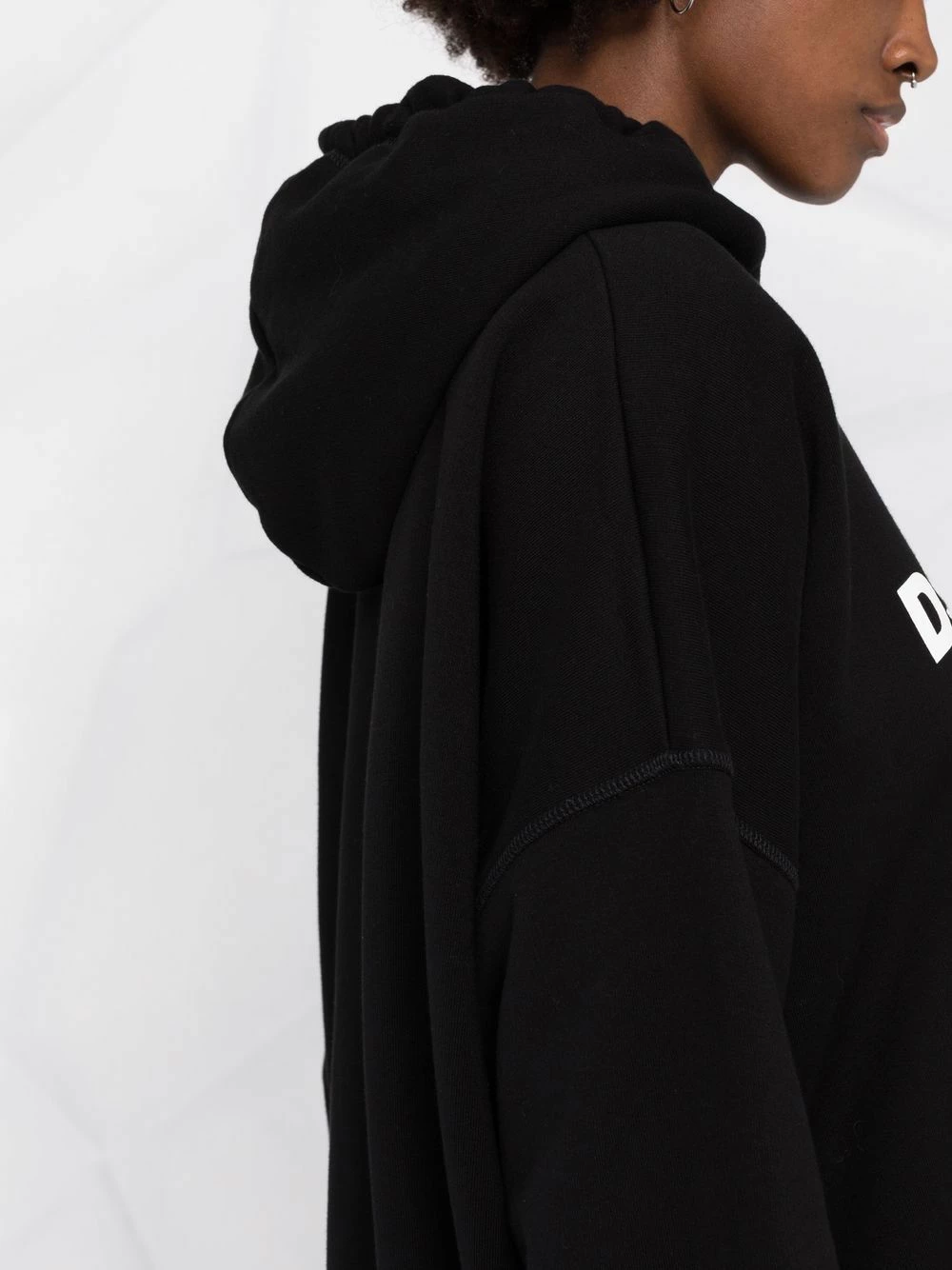 Capuche souple à lien de resserrage, logo imprimé à la poitrine, coutures ton sur ton, effet d’épaules descendues, manches longues, poignets nervurés, ourlet nervuré, longueur au dessus du genou. Matière : coton.