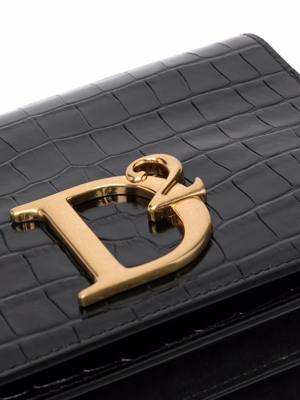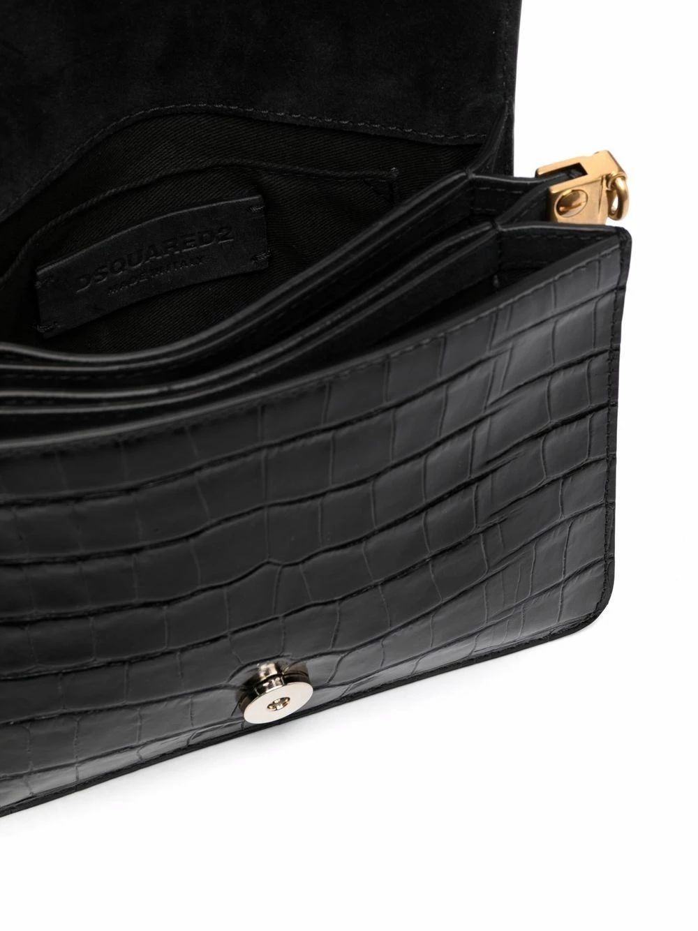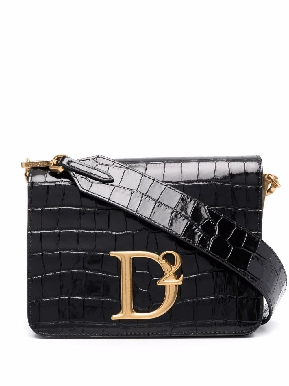 Effet peau de crocodile, plaque logo dorée, rabat sur le dessus à fermeture magnétique, bride porté épaule détachable, compartiment intérieur. Couleur : noir.