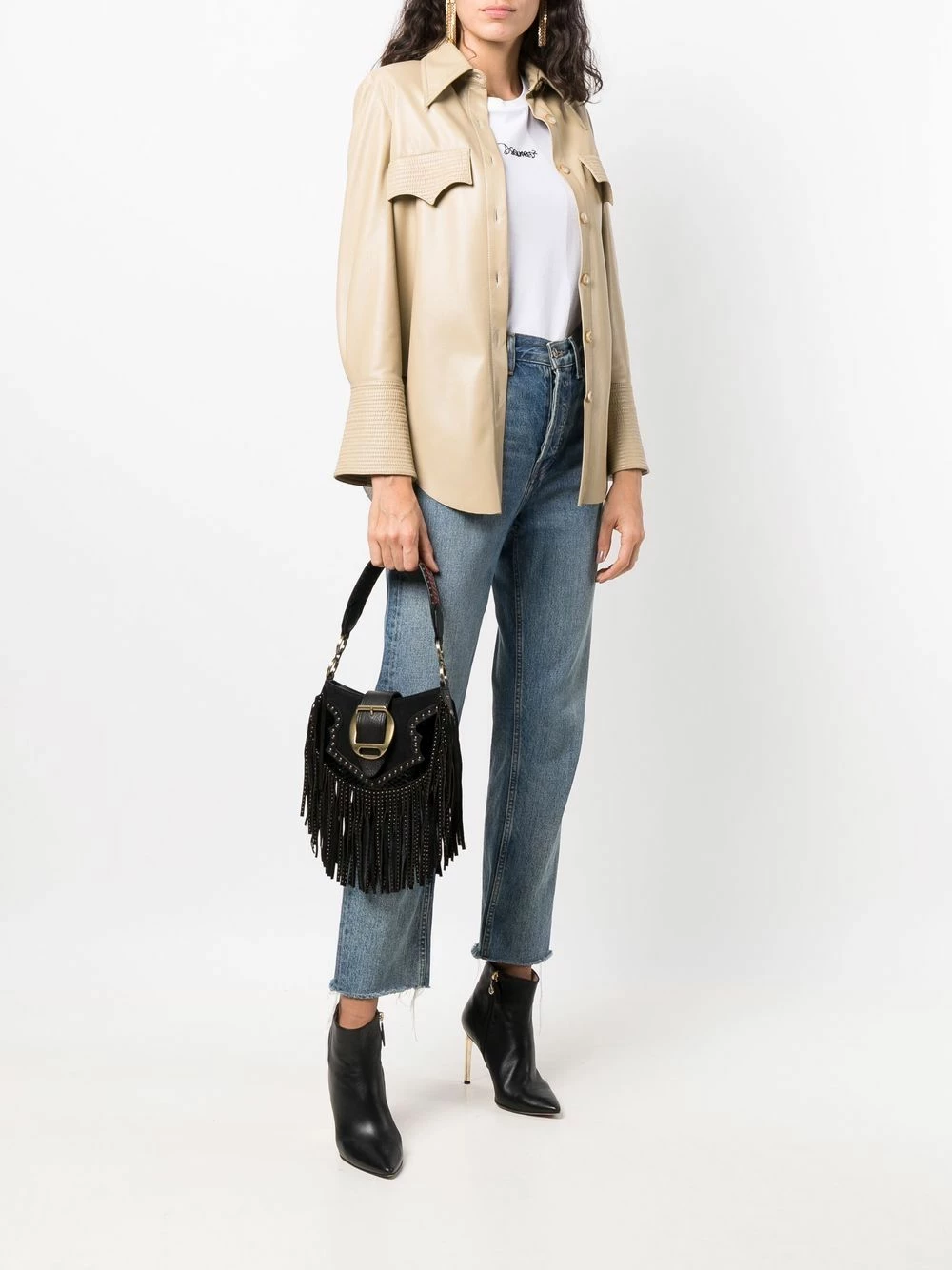 Anse détachable, rabat sur le dessus, fermeture à boucles sur le dessus, finition à franges. Couleur : noir. Matière : cuir de veau.