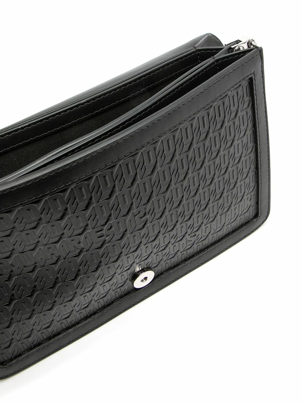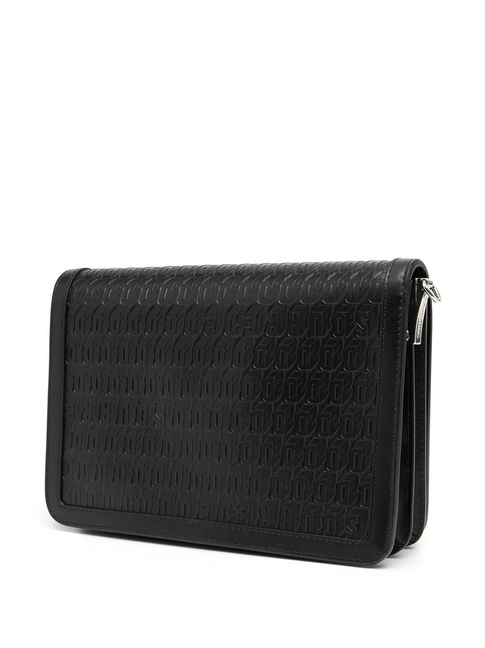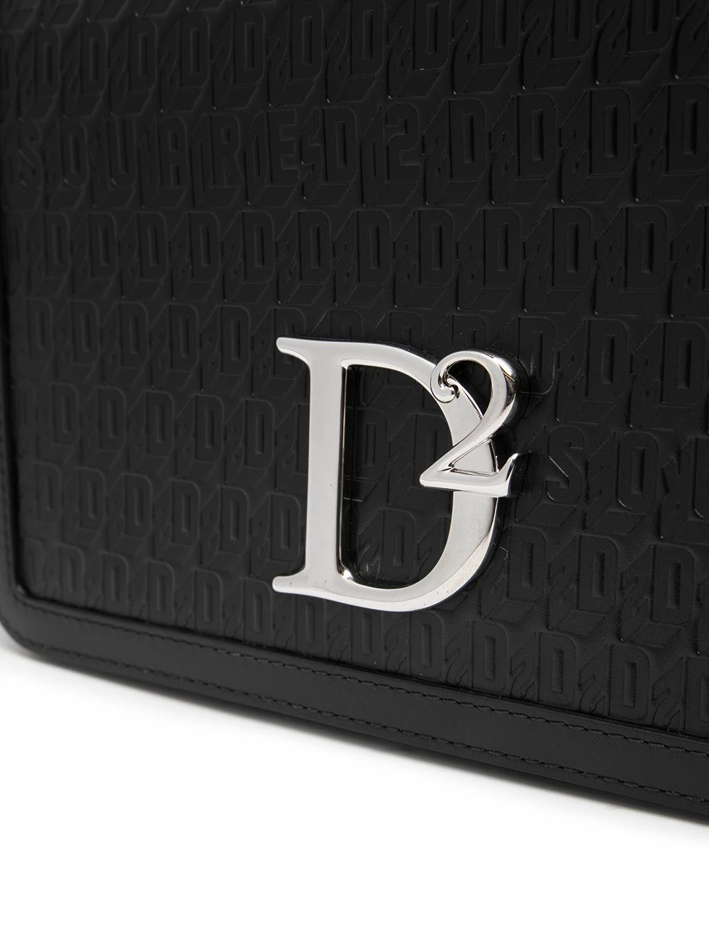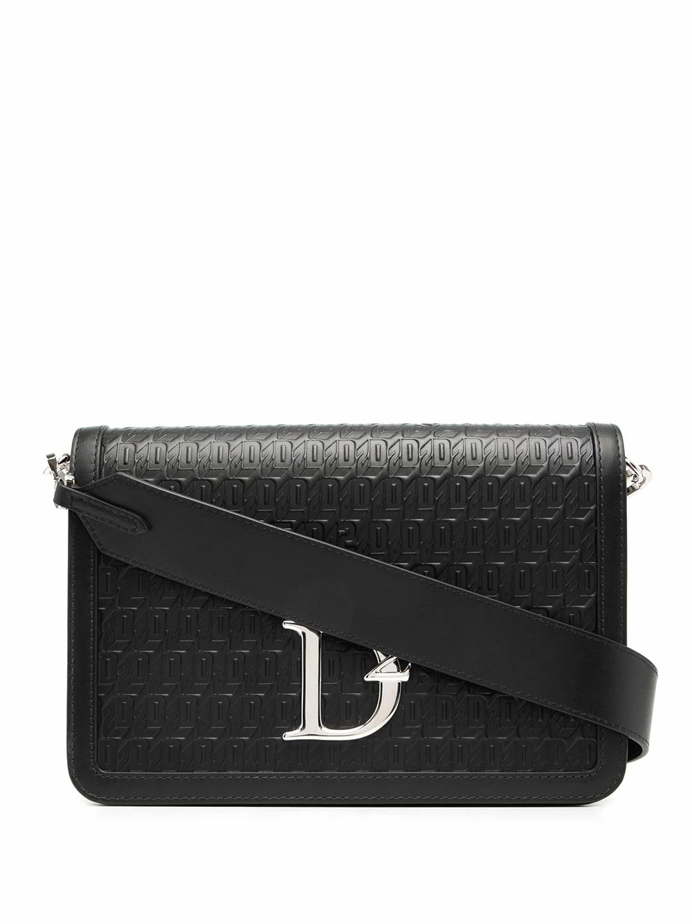 Plaque logo argentée, ornements argentés, motif monogrammé embossé, rabat sur le dessus à fermeture magnétique, bride porté épaule détachable et ajustable. Couleur : noir. Matière : cuir.