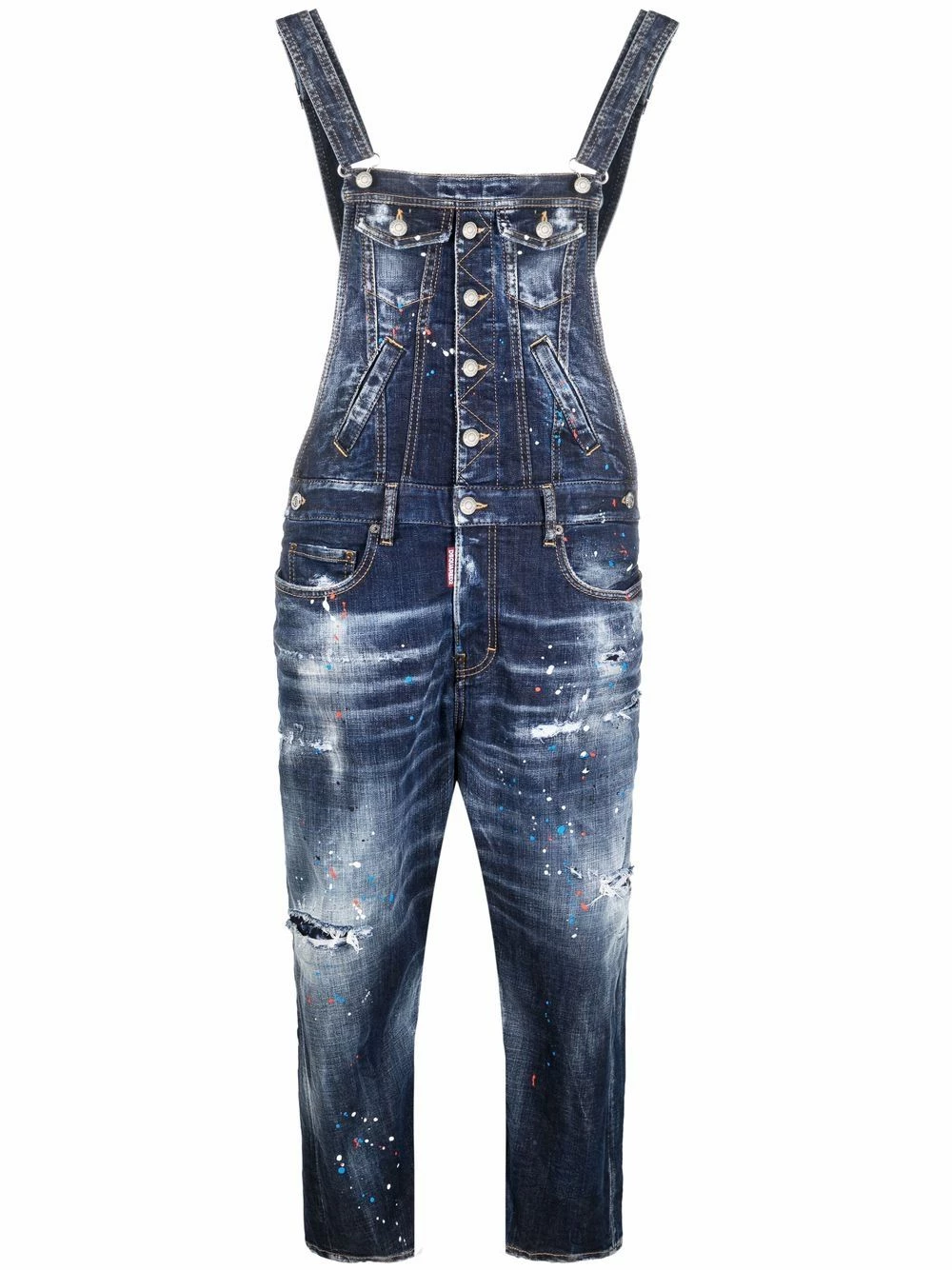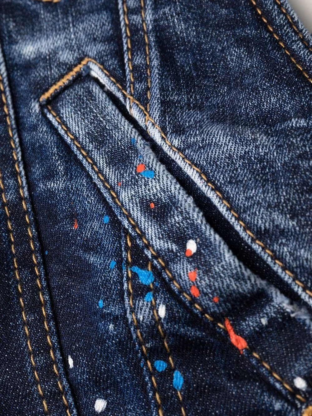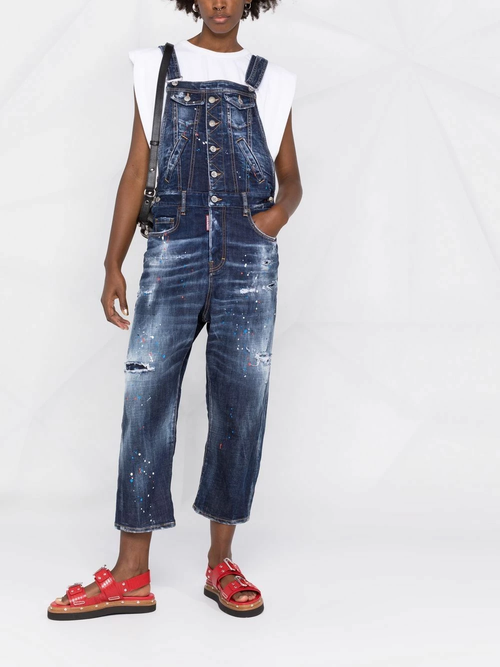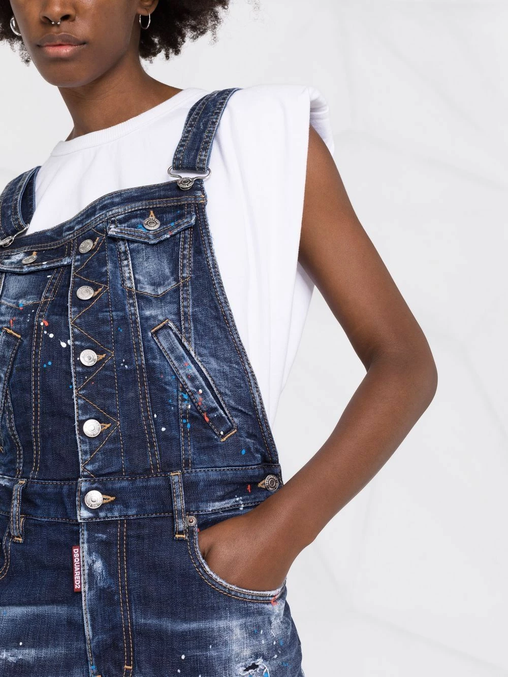 Brides porté épaule ajustables, coutures contrastantes, boutons décoratifs, finitions à effet usé, effet taches de peinture, passants de ceinture, boutonnière sur le côté, cinq poches classiques, deux poches passepoilées avant, dos-nu, coupe droite, coupe courte. Couleur : bleu.