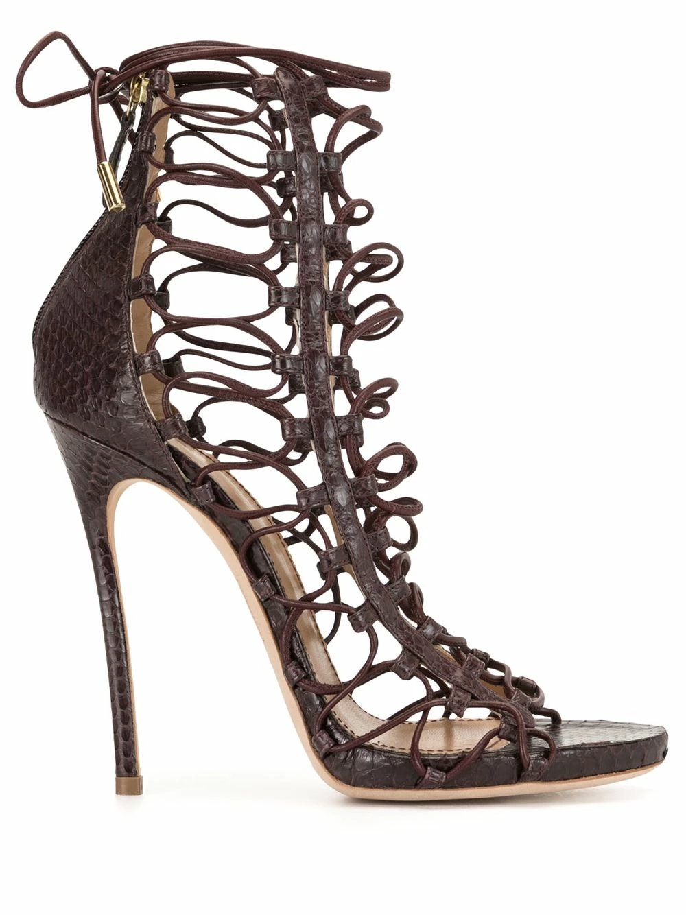Effet peau de serpent, détail de laçage, longueur cheville, bout ouvert, talon aiguille. Couleur : marron. Matière : cuir.