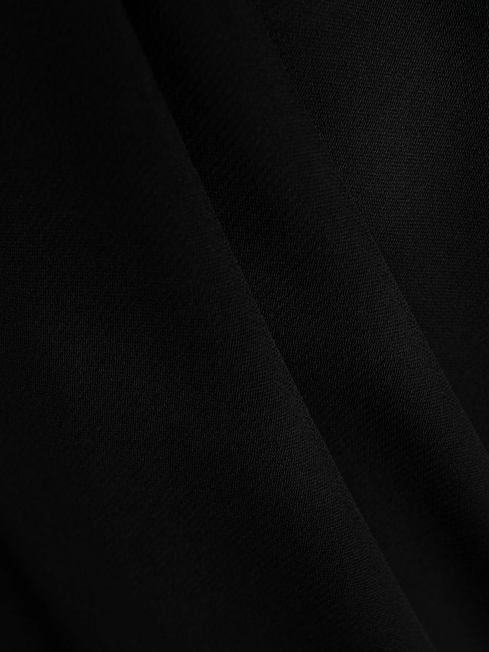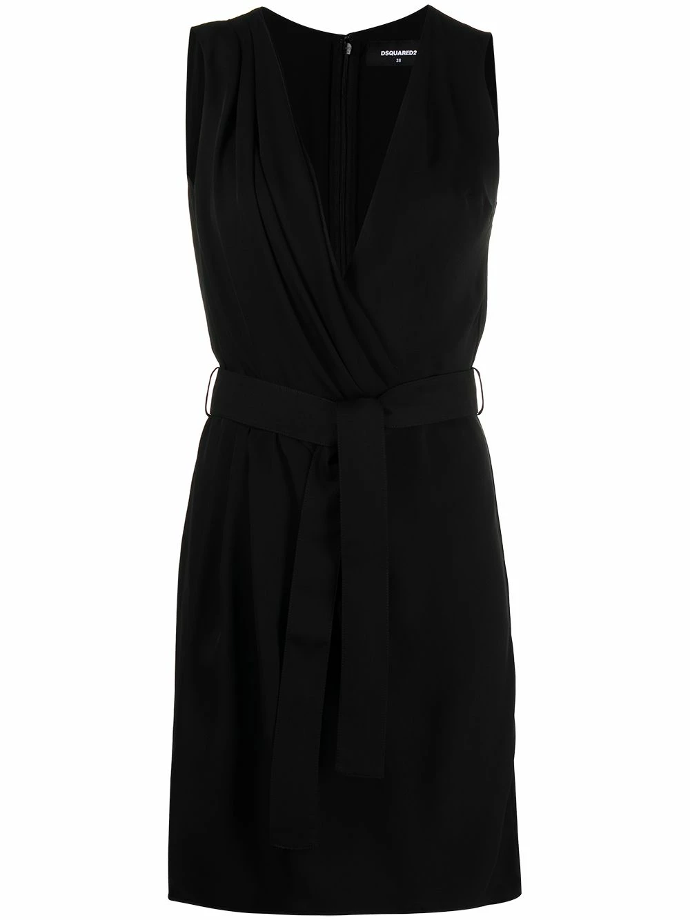 Design portefeuille, col v, design sans manches, taille ceinturée, fermeture zippée à l’arrière. Couleur : noir. Matière : soie.
