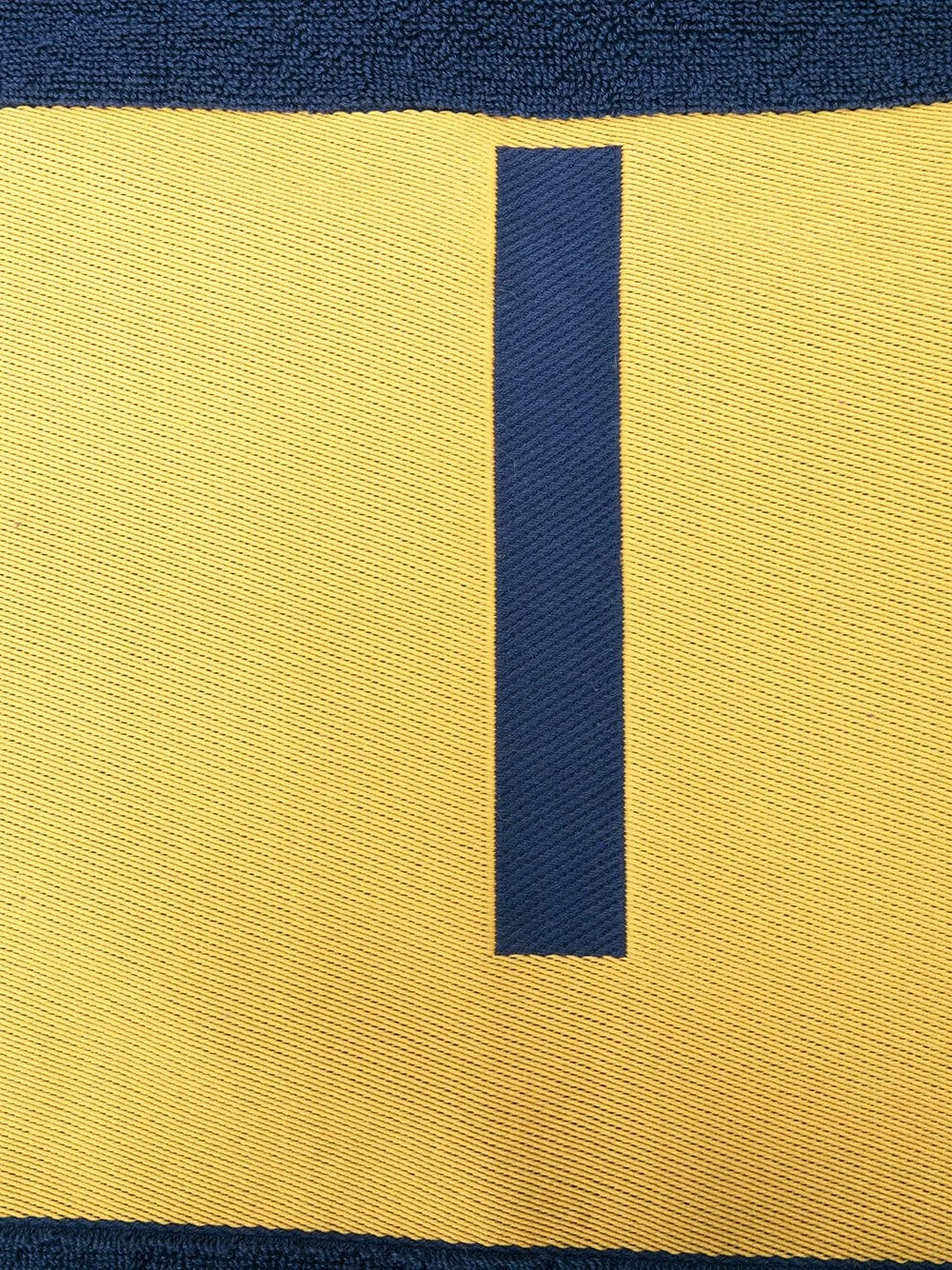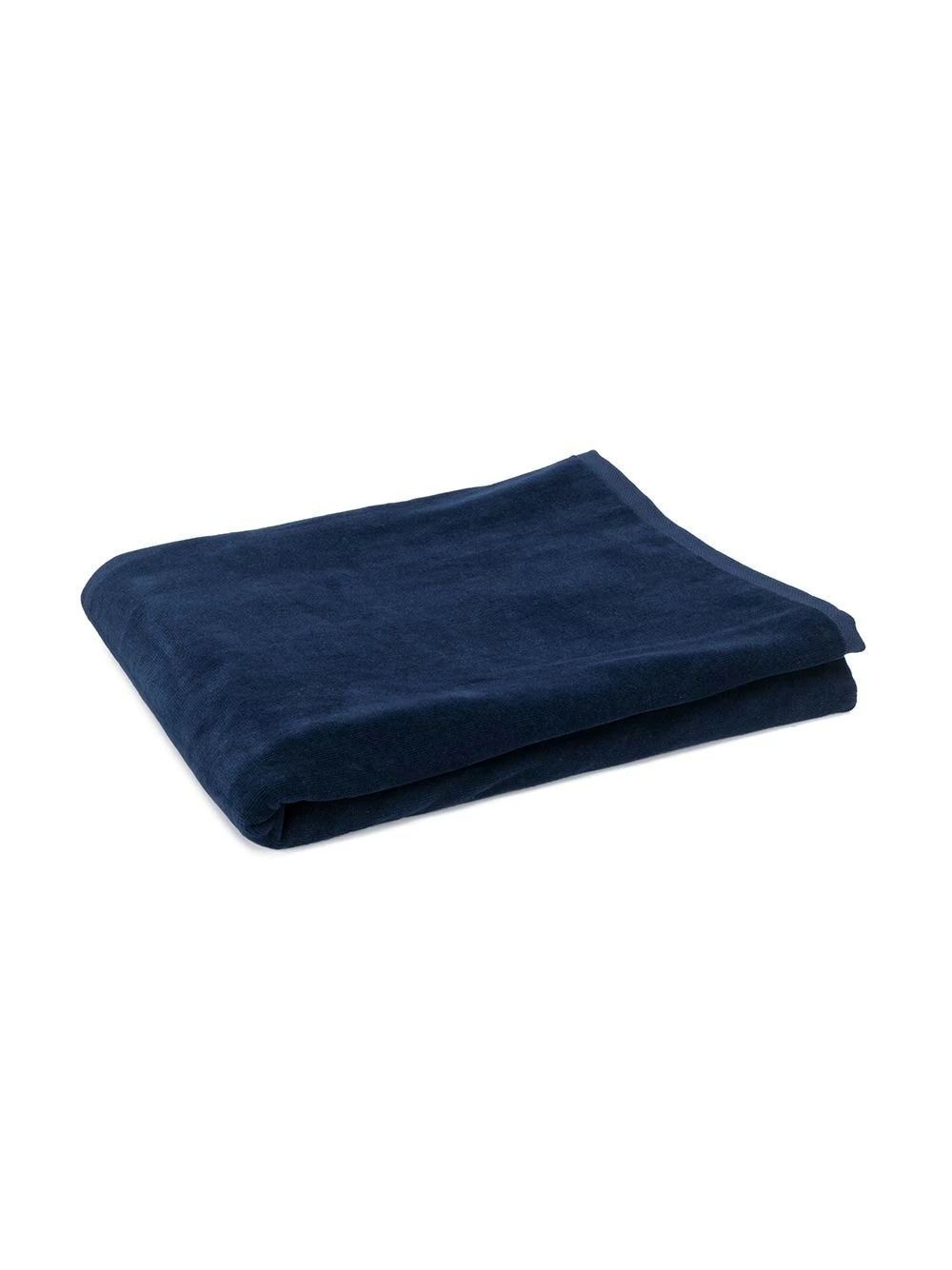 Forme rectangulaire, logo imprimé sur le devant, bords finis. Couleur : bleu. Matière : coton.