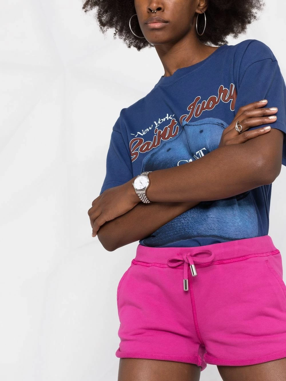 Détail nervuré, logo imprimé à l’arrière, taille élastique à lien de resserrage, ornements argentés, poches latérales fendues, ourlet retroussé. Matière : coton.