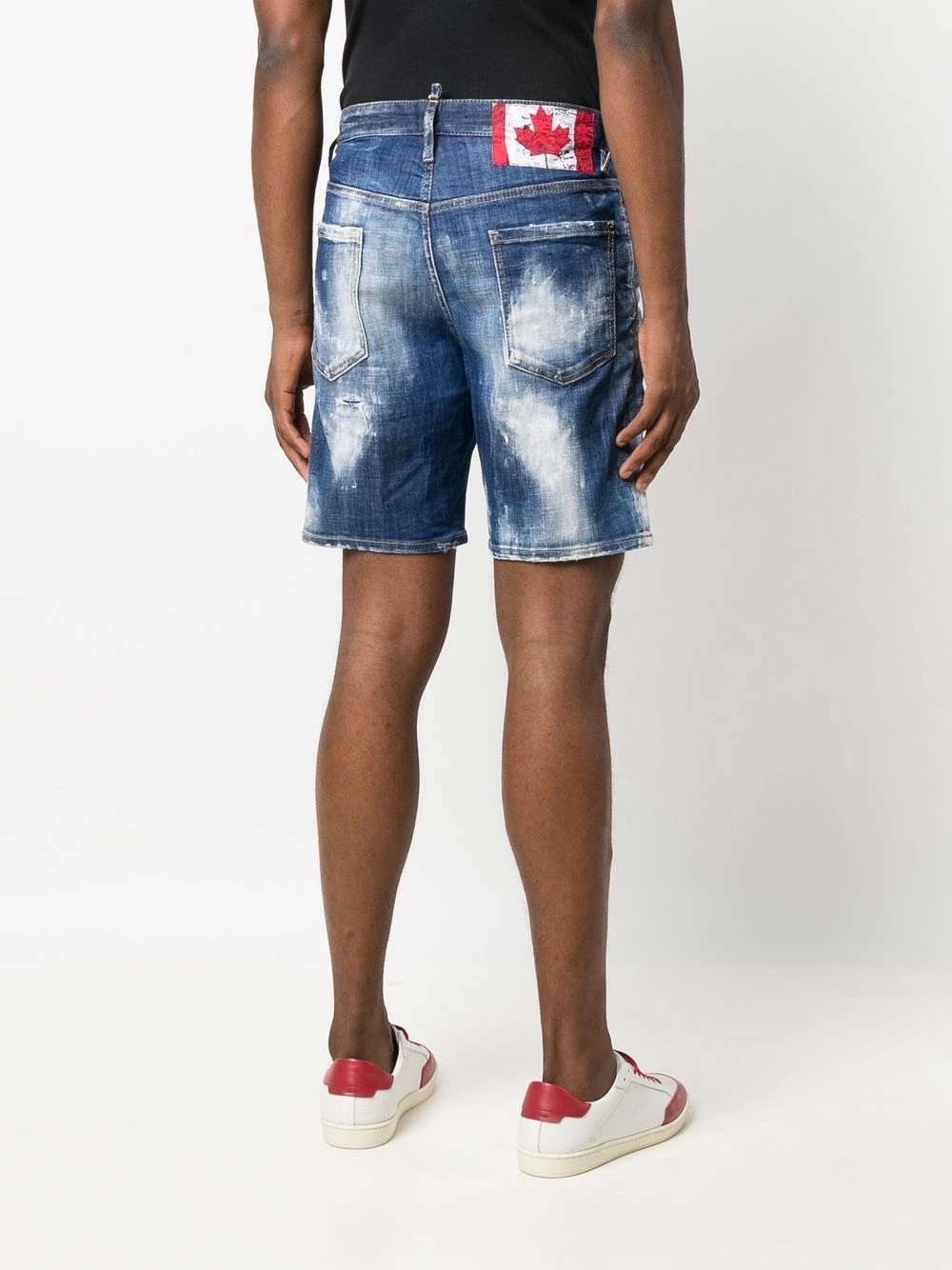 Effet usé, patch logo sur l’arrière, passants de ceinture, fermeture dissimulée sur le devant, cinq poches classiques, hauteur genou.