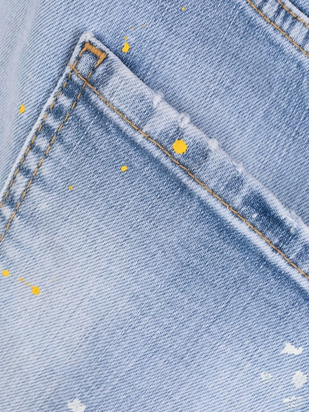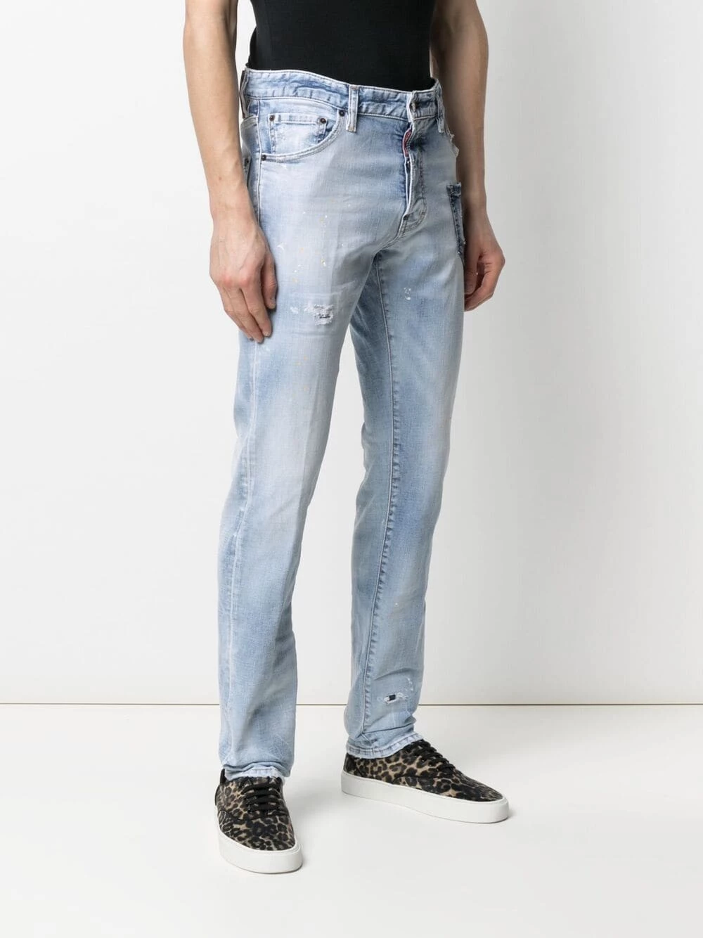 Effet usé, effet taches de peinture, fermeture boutonnée, passants de ceinture, 5 poches classiques, coupe skinny.