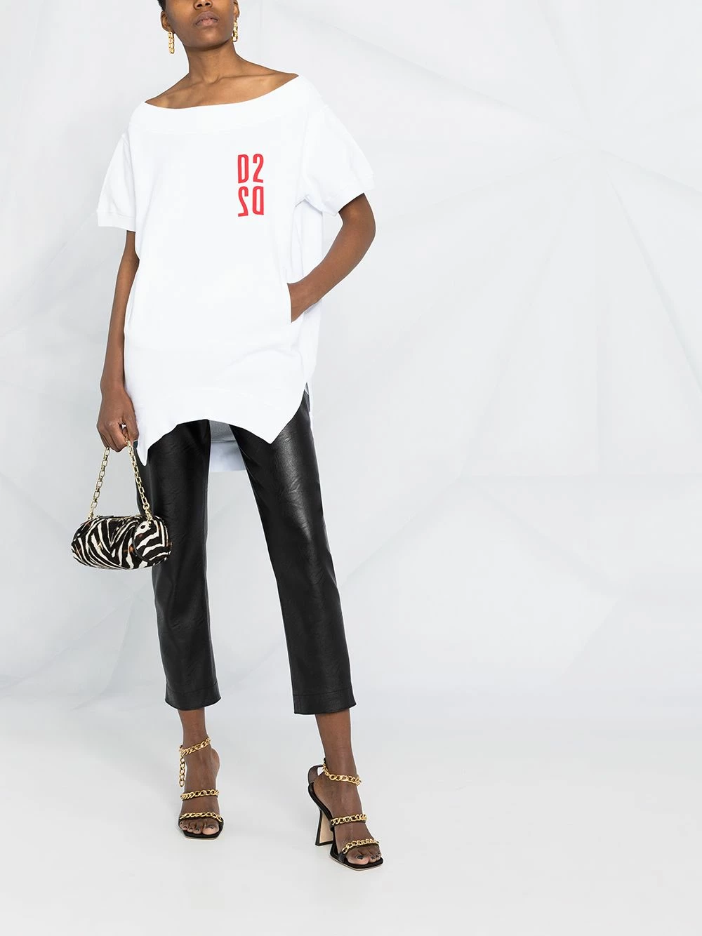 Logo imprimé à la poitrine, design asymétrique, encolure bateau, manches courtes. Matière : coton.