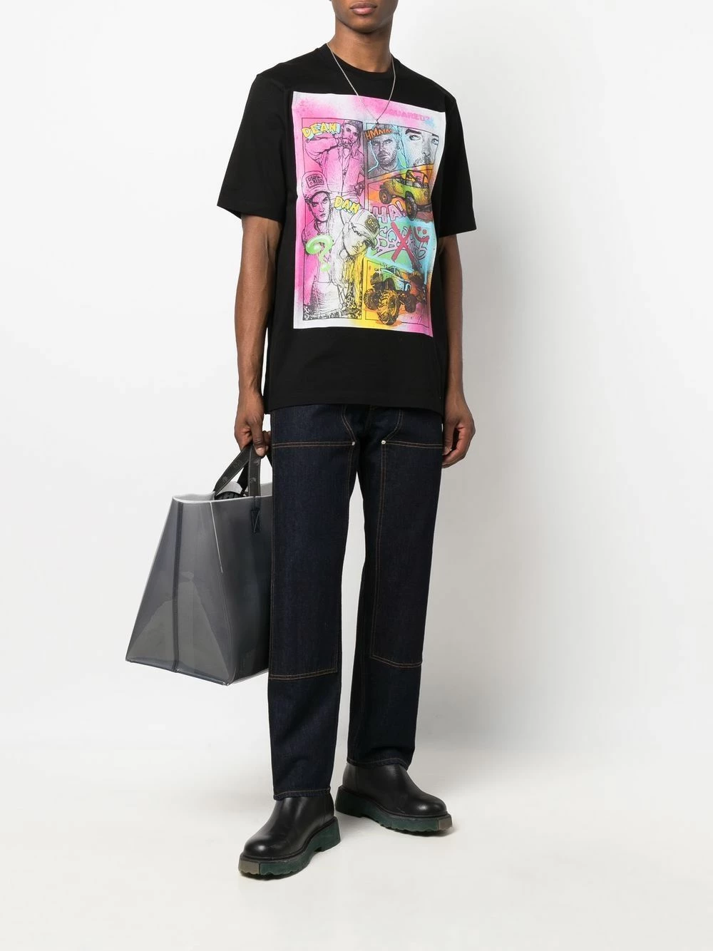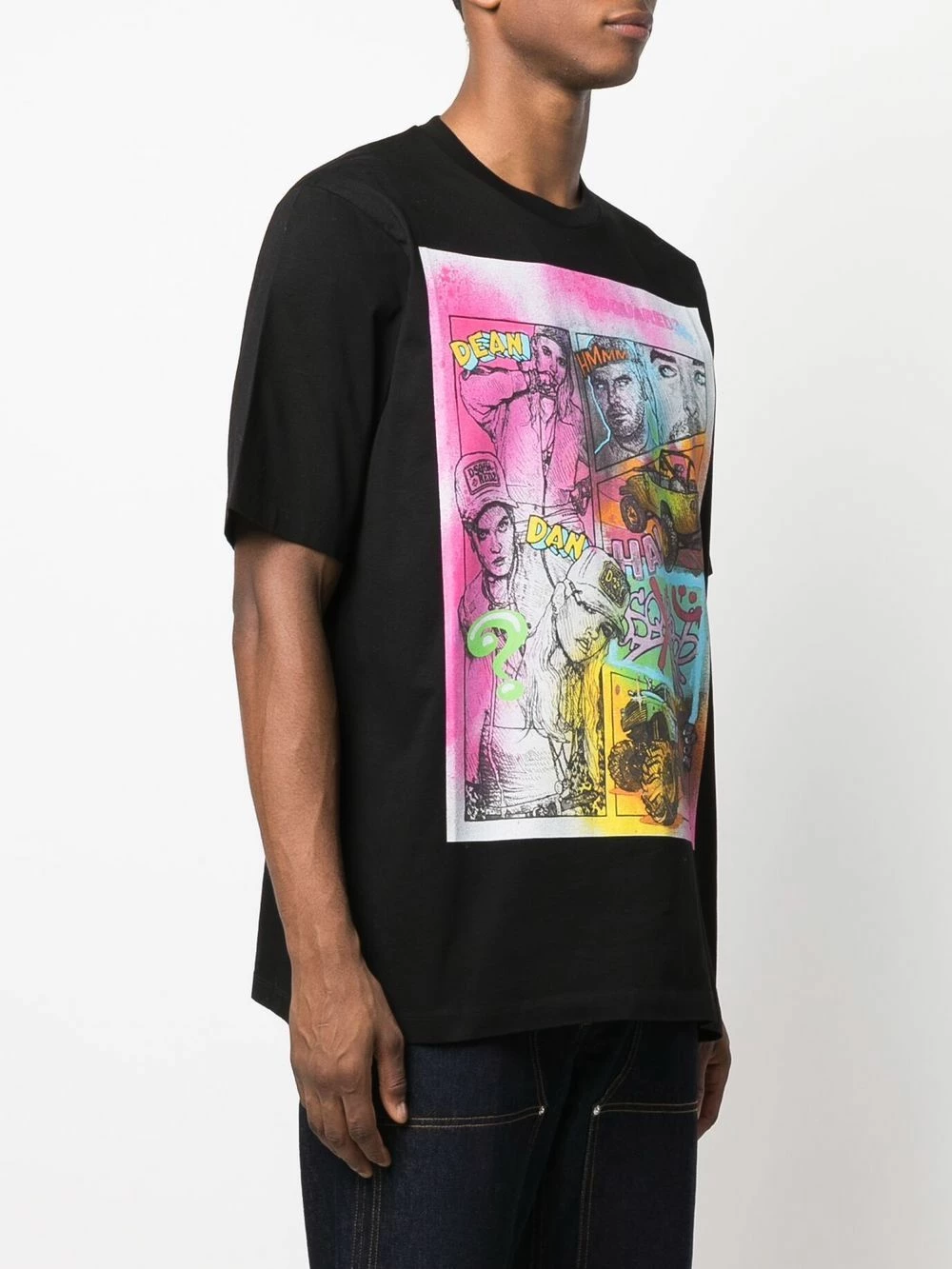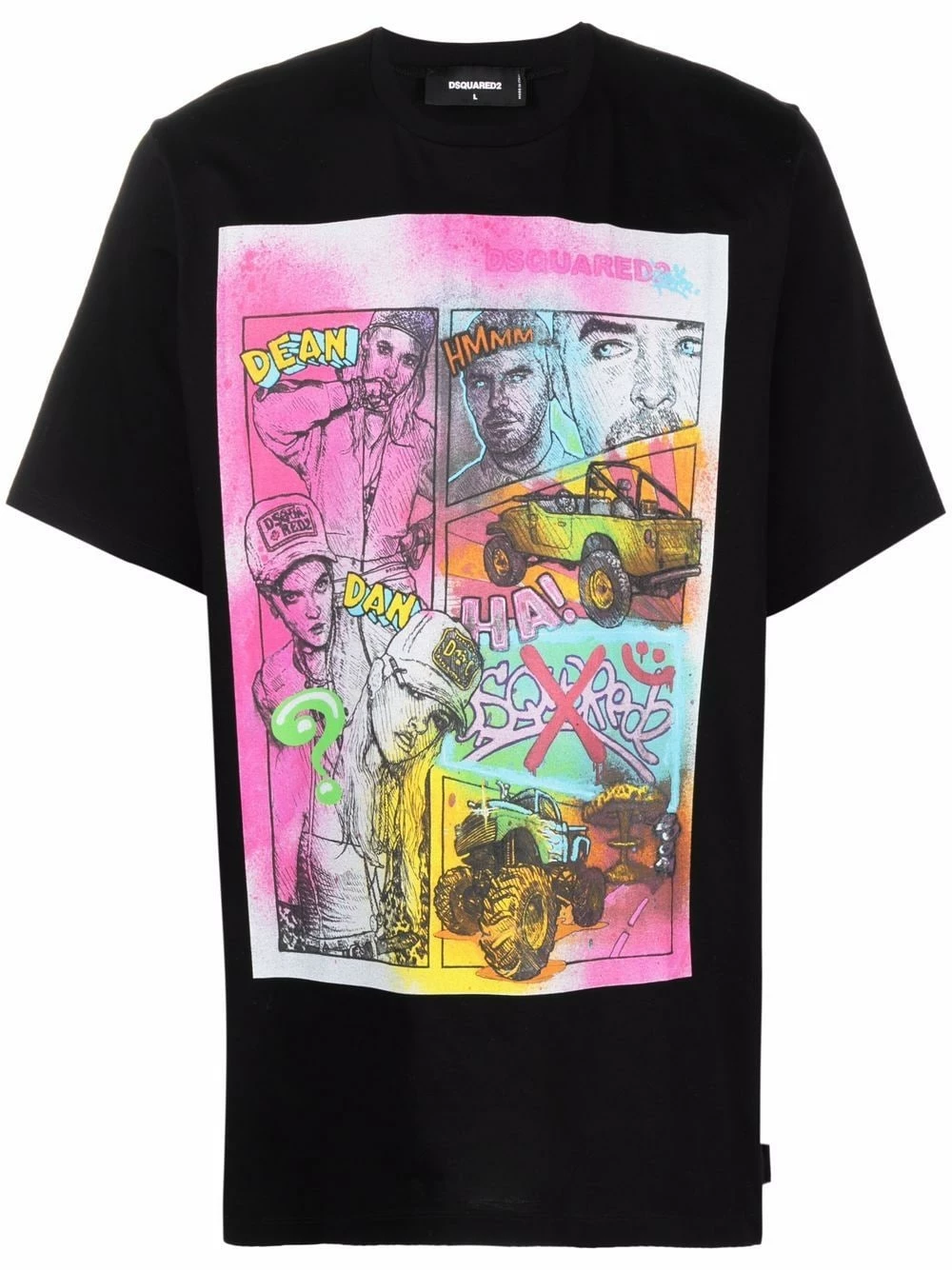 Noir, imprimé graphique, encolure ras du cou, manches courtes, ourlet droit.