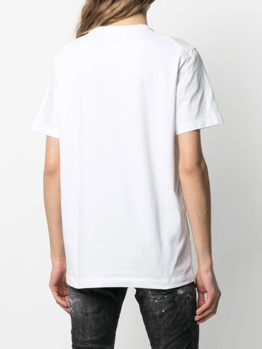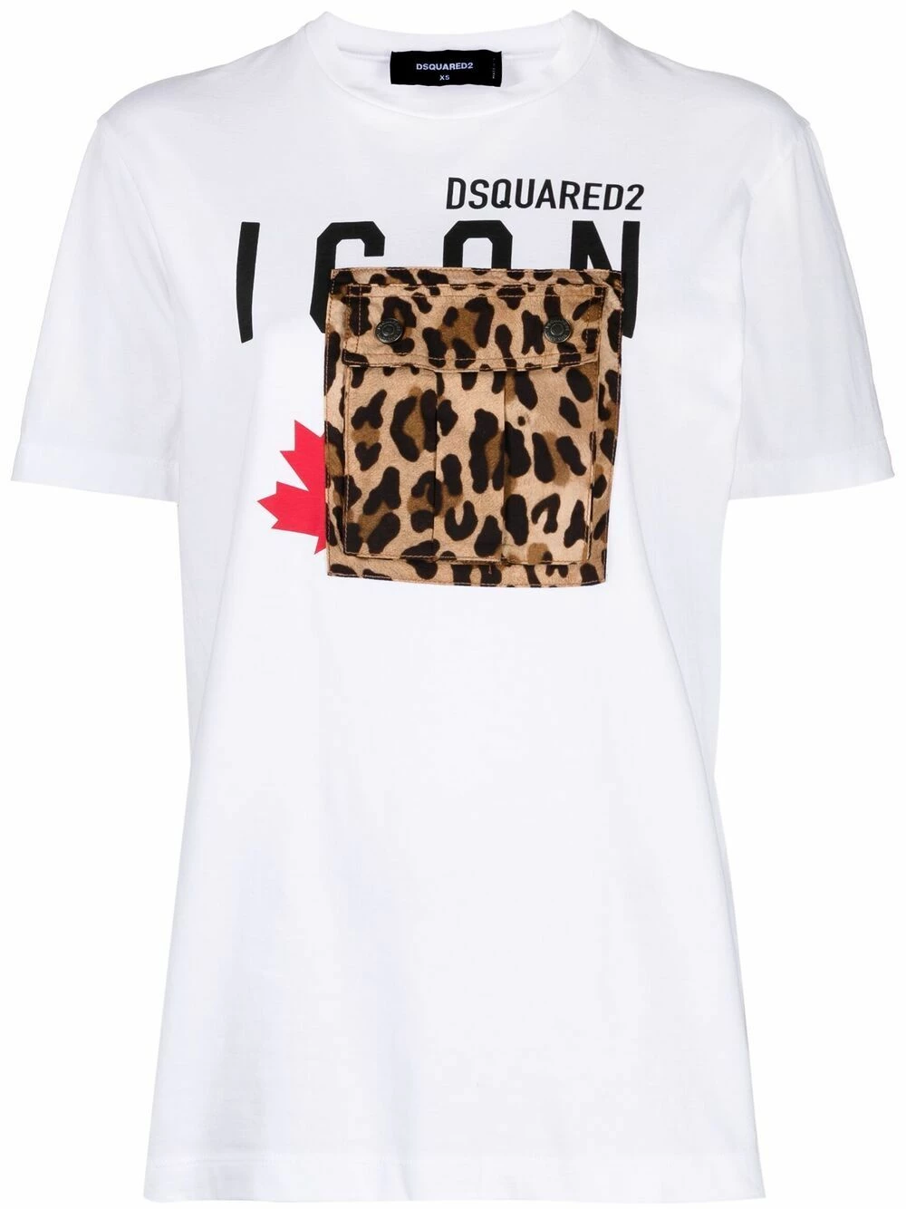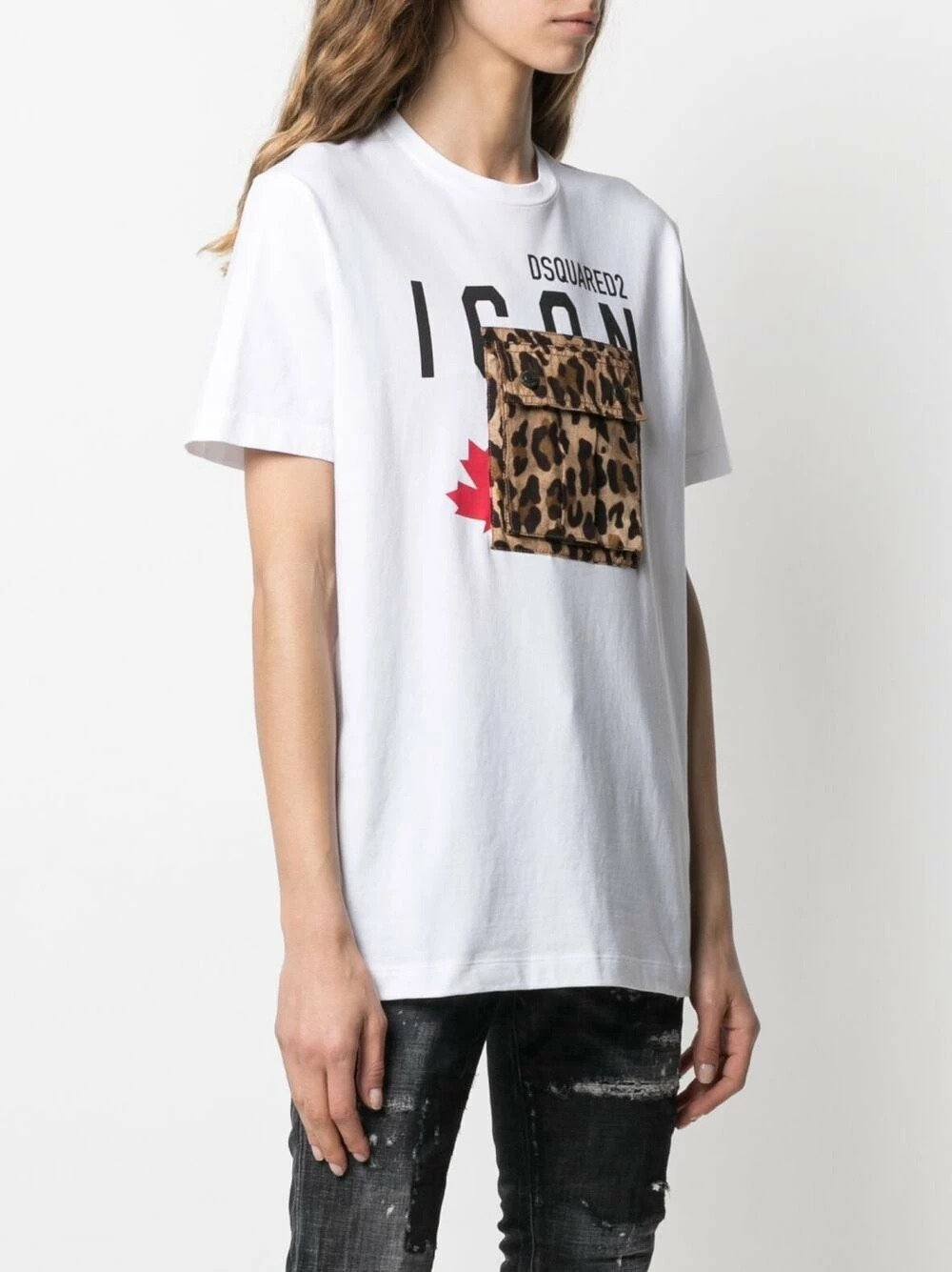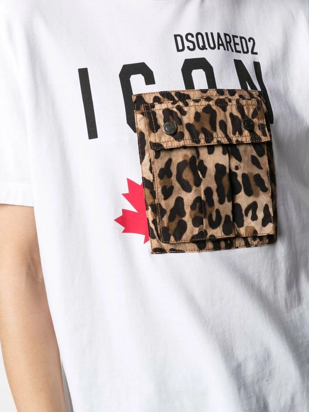 Tricot point jersey, logo imprimé à la poitrine, imprimé léopard, encolure ras du cou, poche plaquée sur le devant, manches courtes. Couleur : blanc. Matière : coton.
