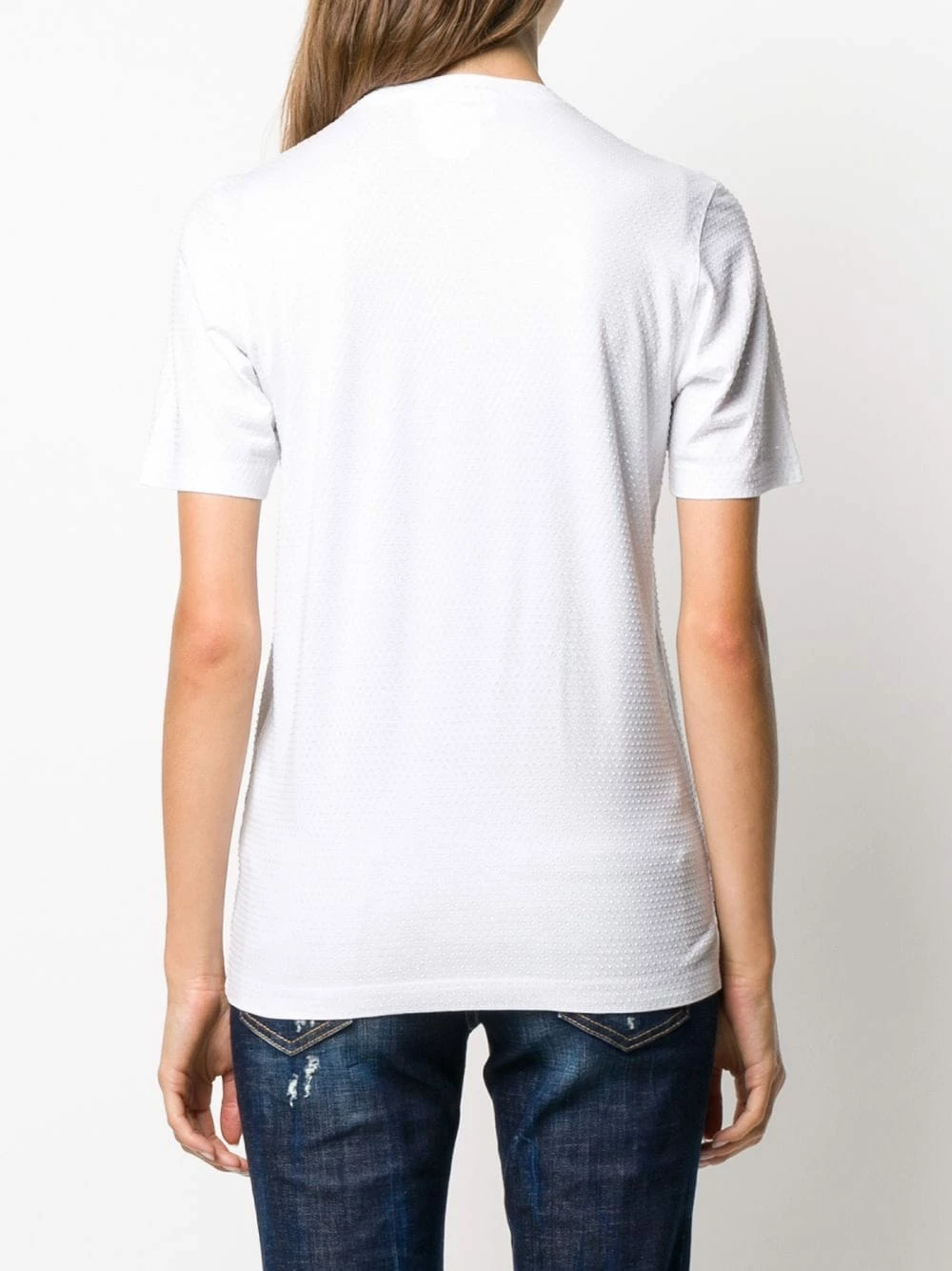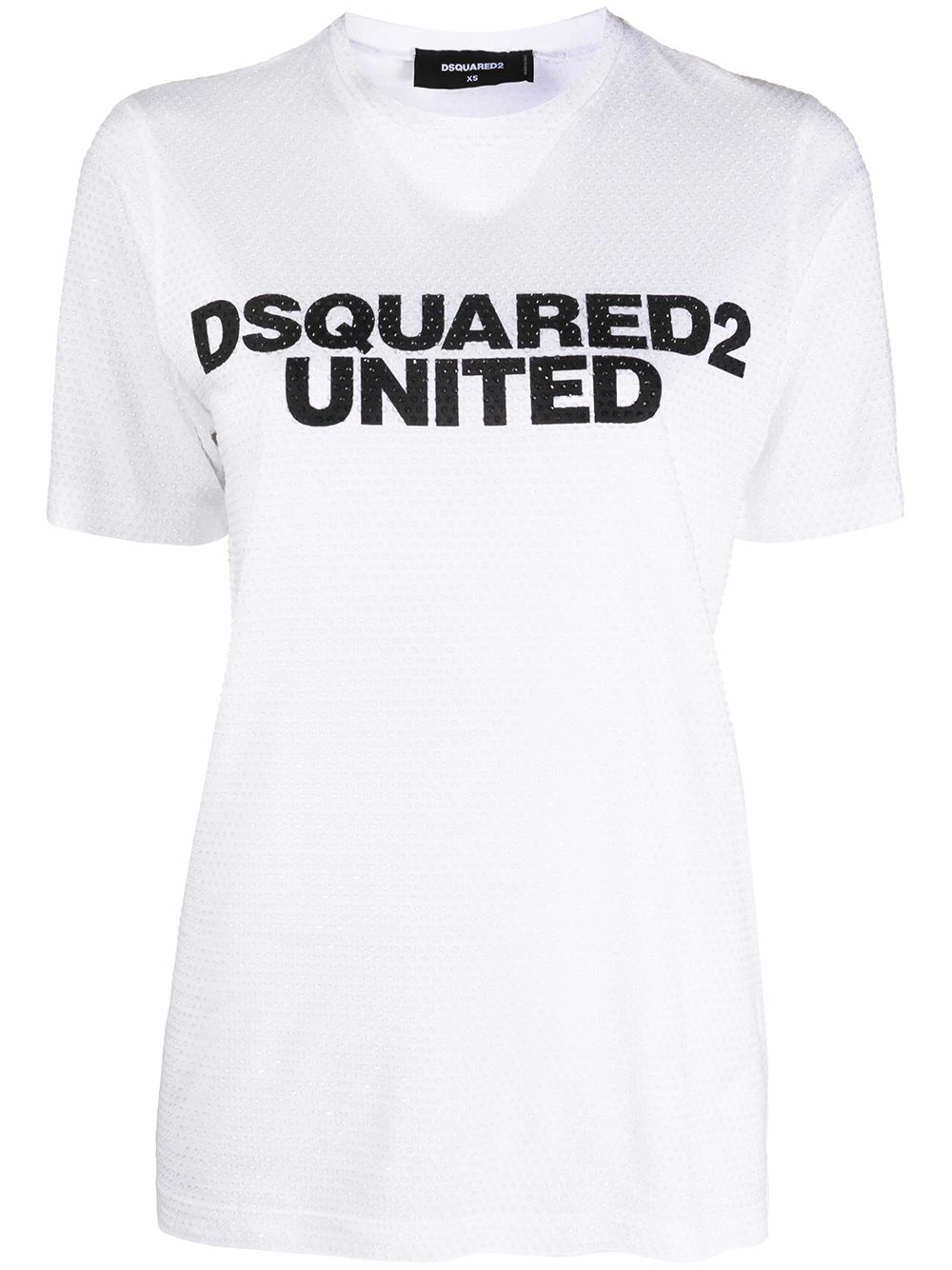 Logo imprimé à la poitrine, encolure ronde, manches courtes, ourlet droit, ornements en pierres précieuses. Matière : coton.