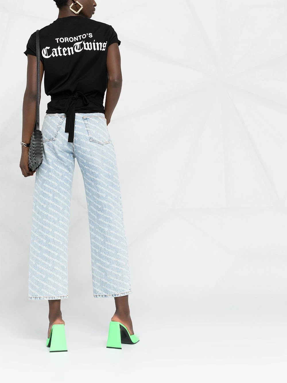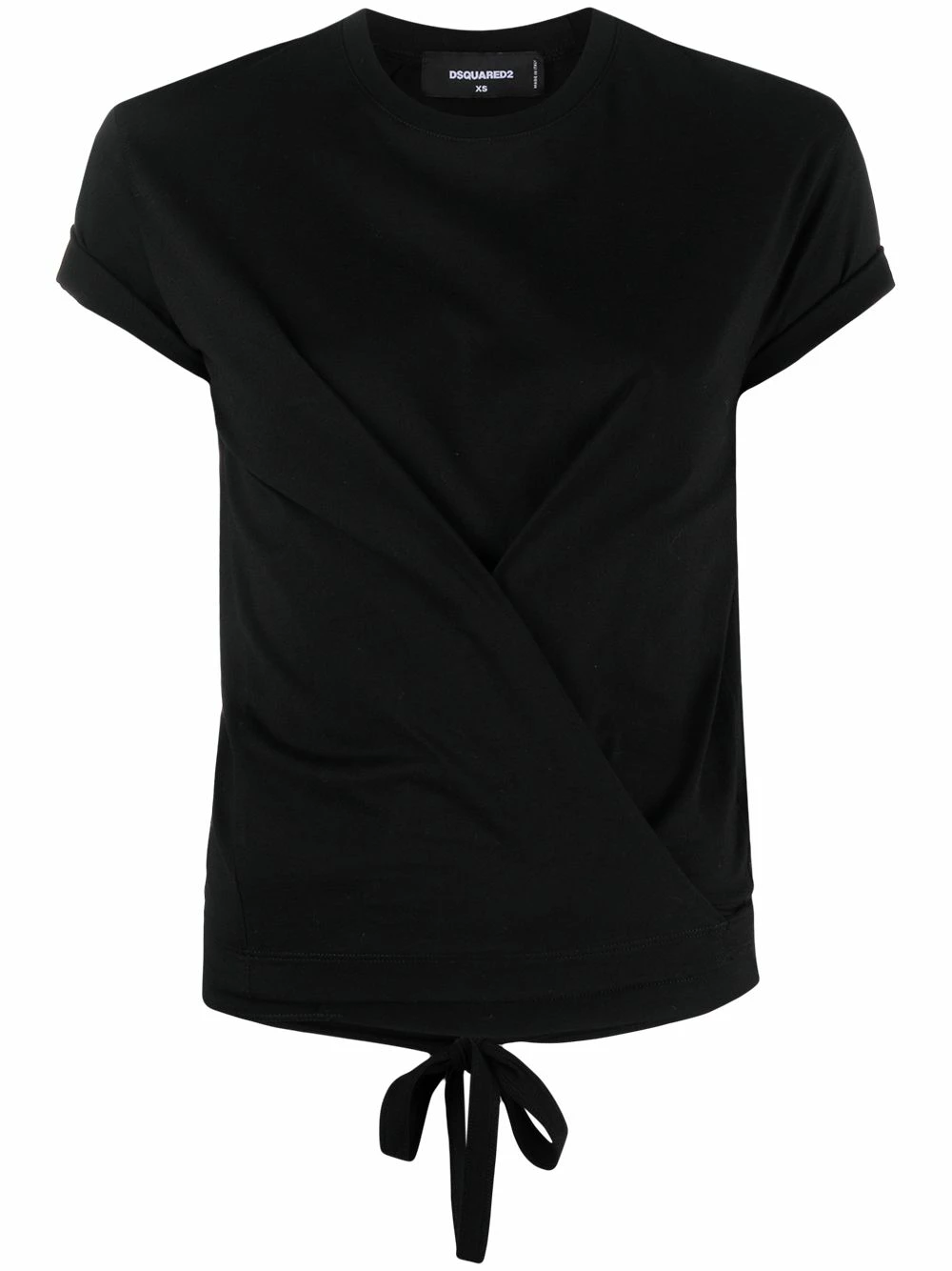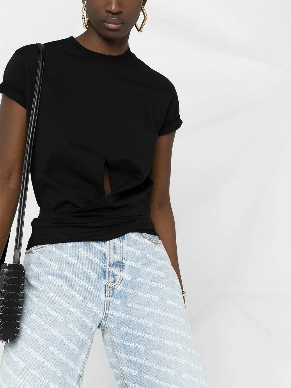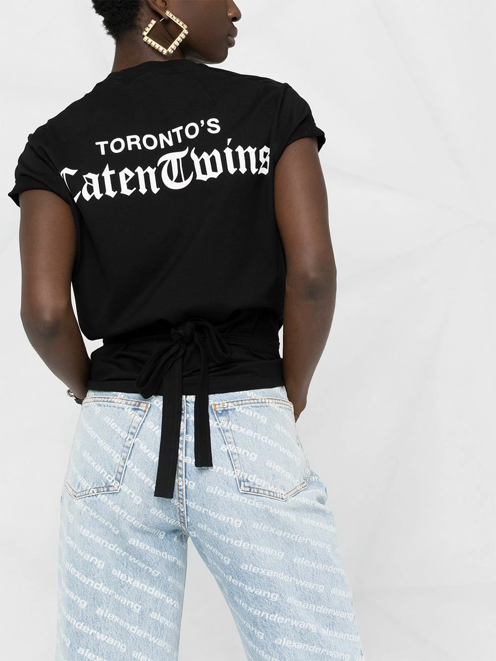 Coupe courte, design portefeuille, slogan imprimé à larrière, encolure ronde, manches courtes, taille nouée. Couleur : Noir. Matière : coton.