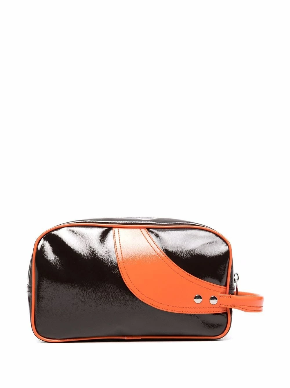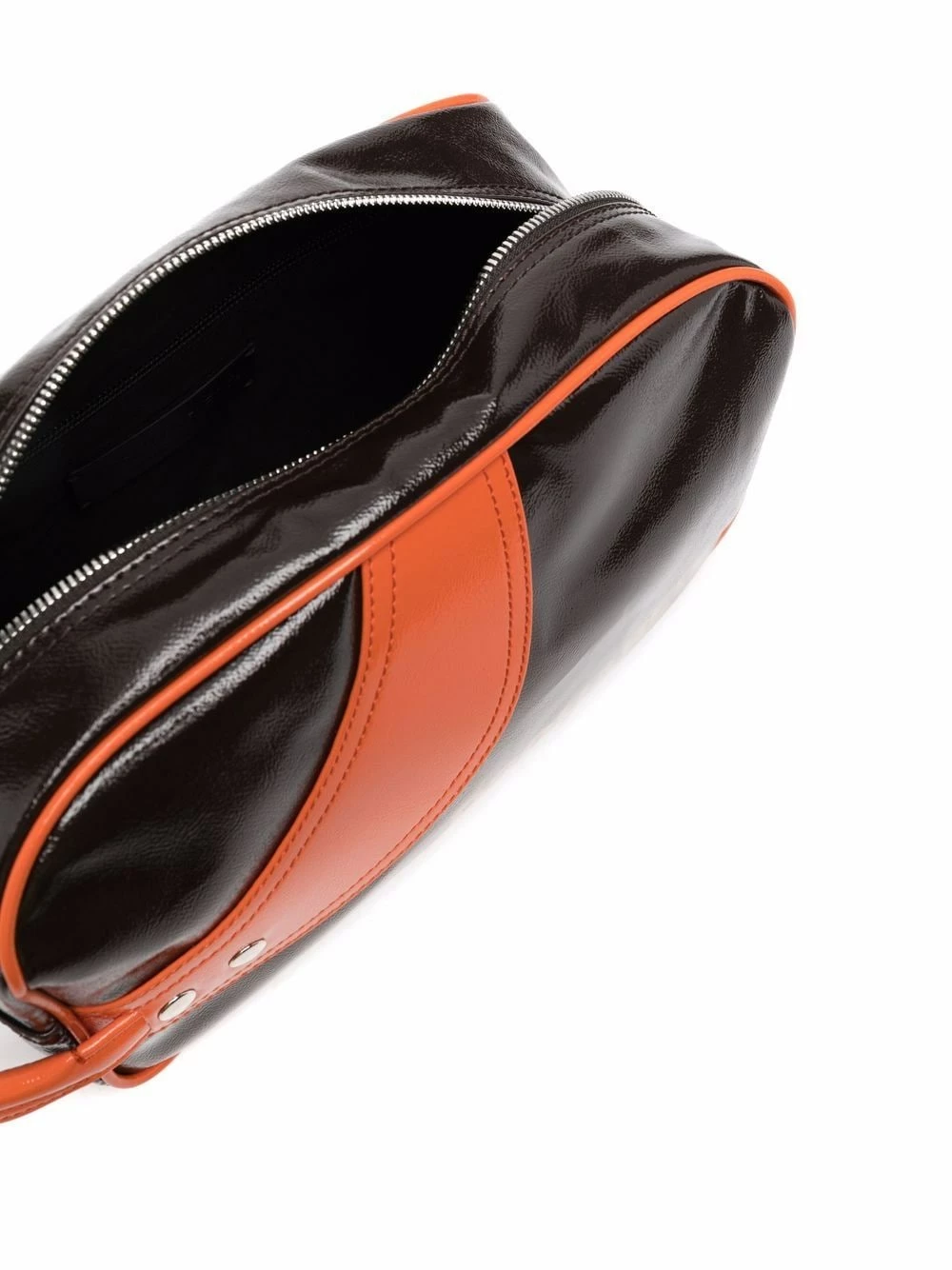Logo imprimé sur le devant, fini verni, empiècements contrastants, fermeture zippée sur le dessus, anse sur le devant. Matière : coton.