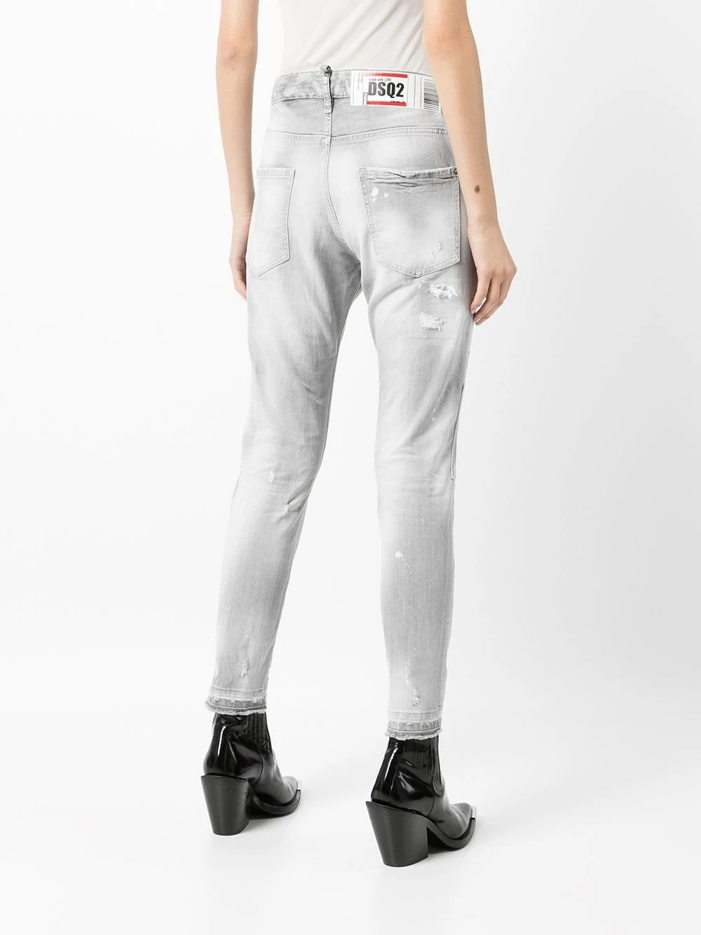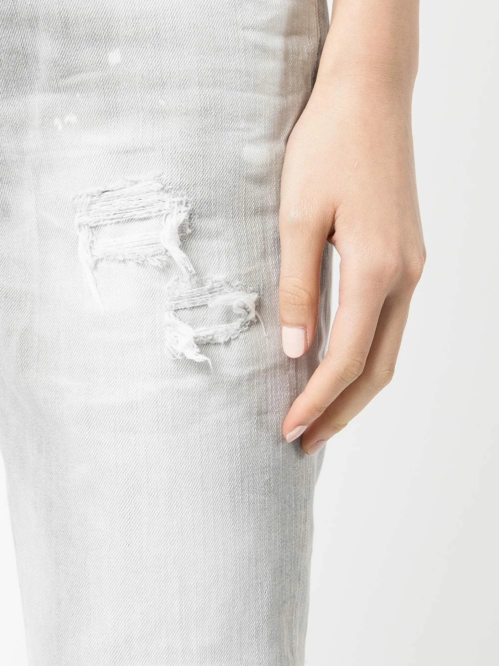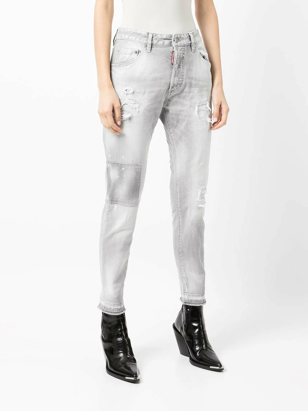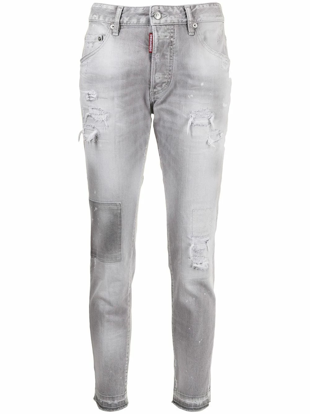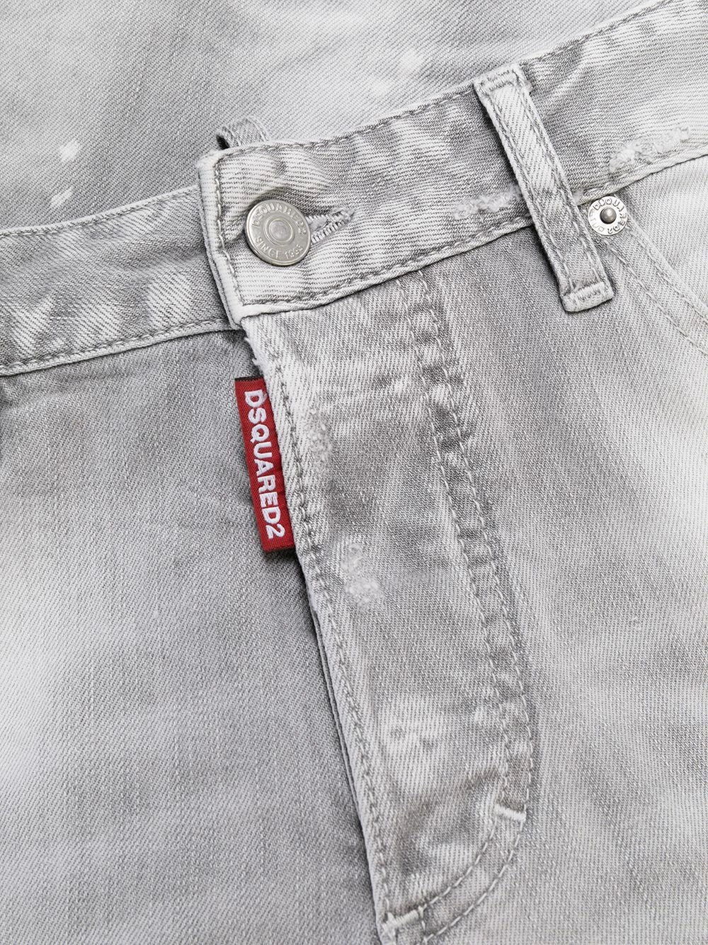 Effet usé, détail de patch, cinq poches classiques, boutonnière sur le devant, passants de ceinture.