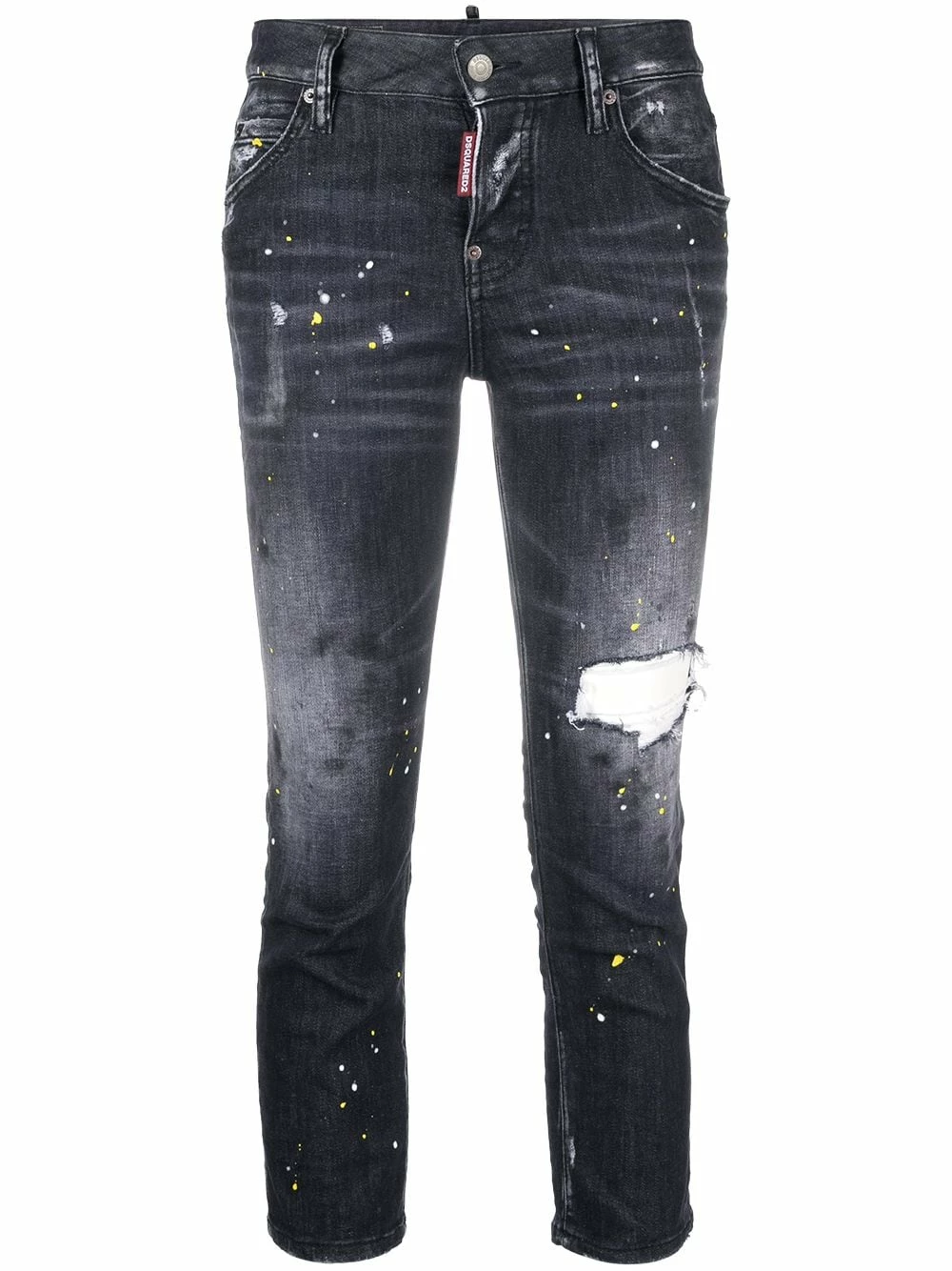 Effet taches de peinture, finitions effilochées, effet délavé, taille basse, coupe courte, passants de ceinture, fermeture dissimulée sur le devant, 5 poches classiques. Couleur : Noir.