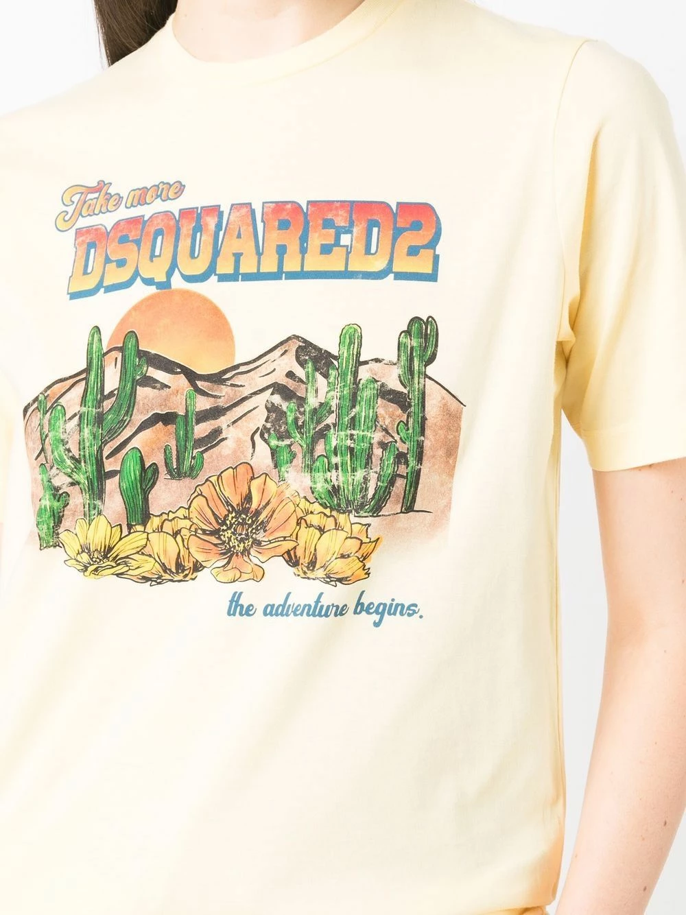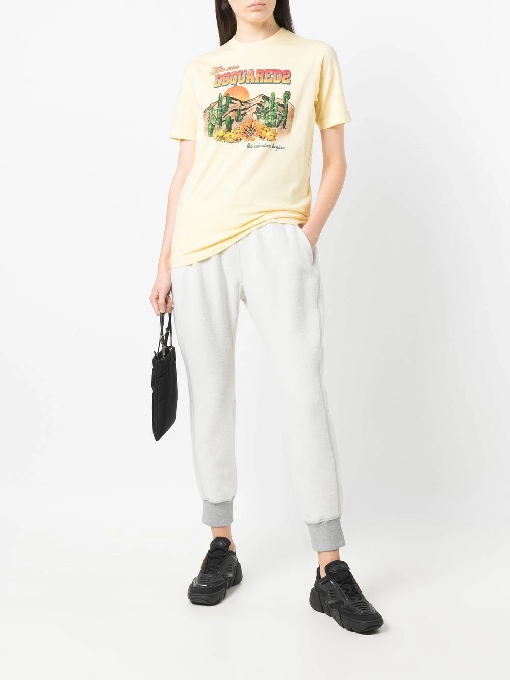 Imprimé façon illustration, logo imprimé sur le devant, encolure ronde, manches courtes, ourlet droit. Matière : coton.