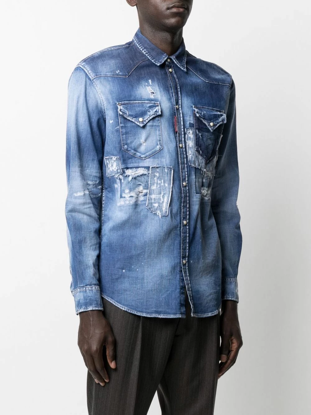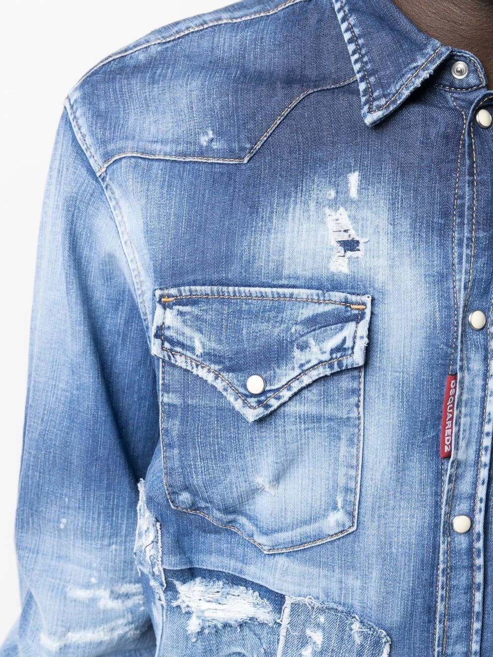 Effet délavé, effet usé, col pointu, deux poches poitrines boutonnées, fermeture à boutons pression sur le devant, manches longues. Couleur : bleu.
