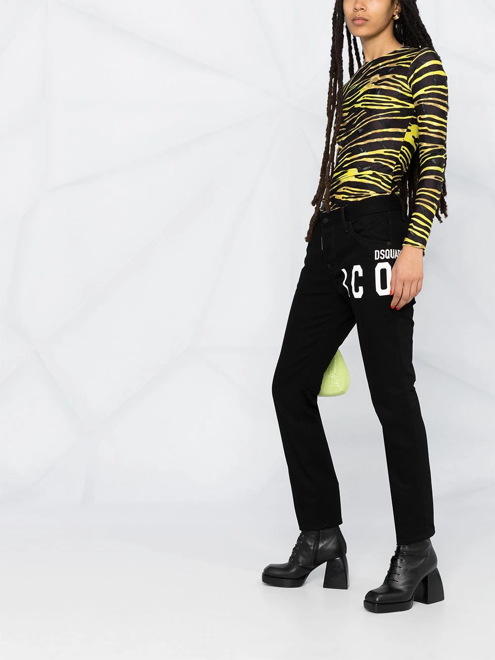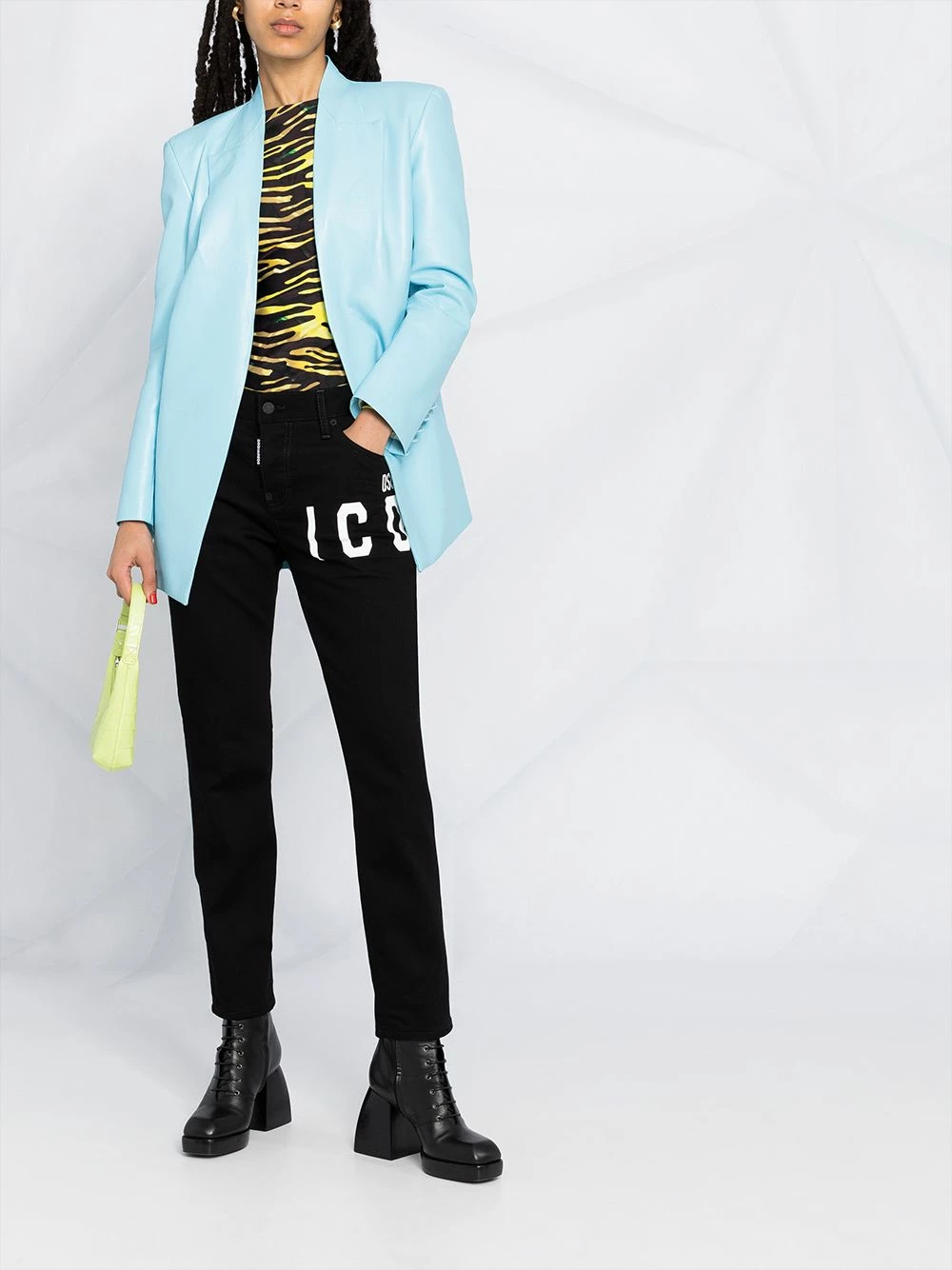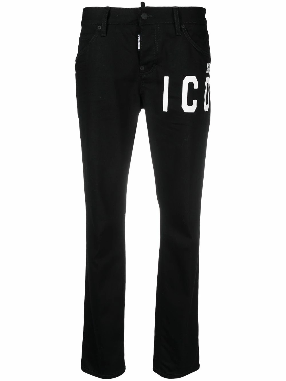 Slogan imprimé, détails de rivets, coupe ajustée, passants de ceinture, fermeture dissimulée sur le devant, 5 poches classiques. Couleur : noir.