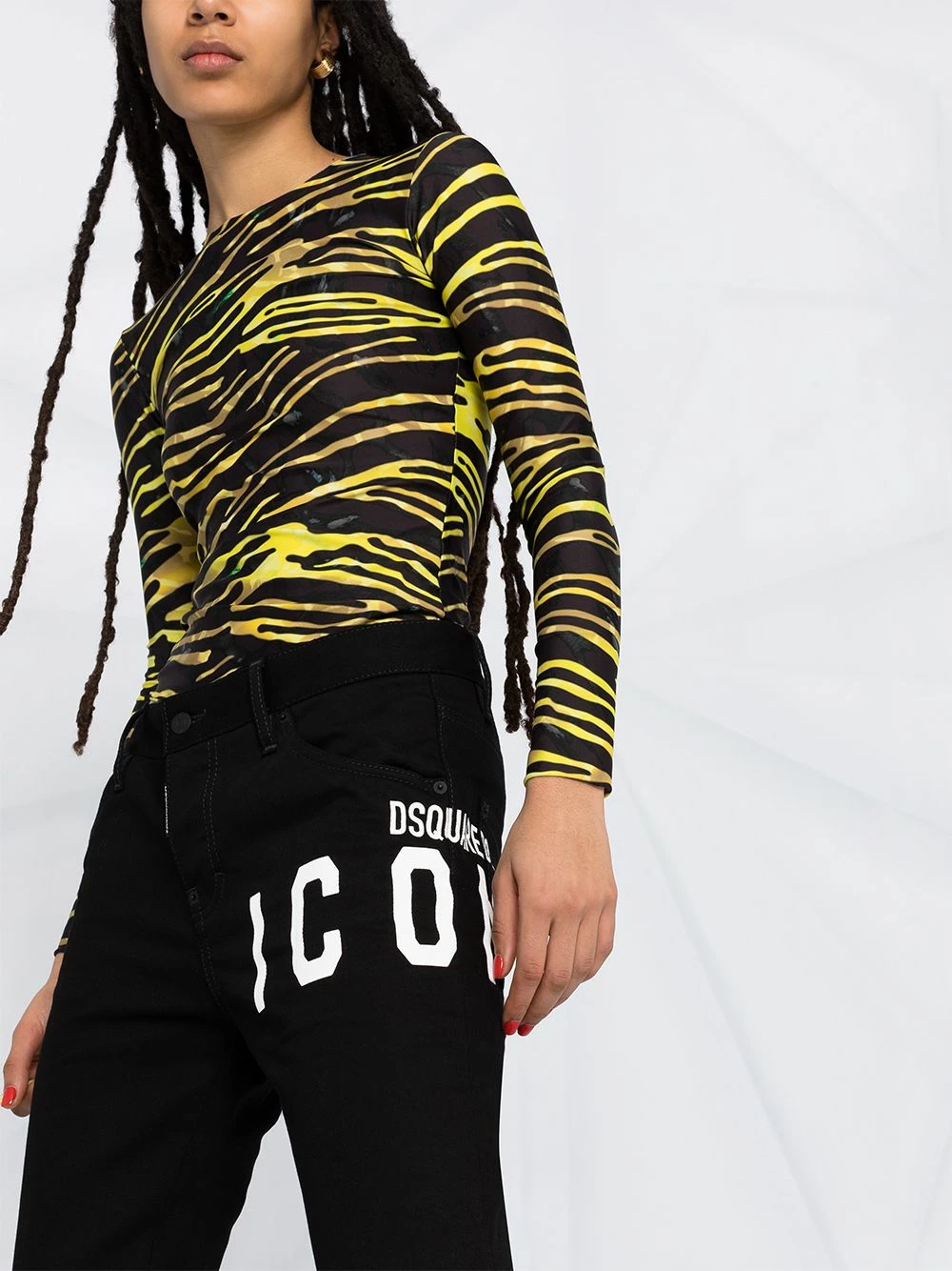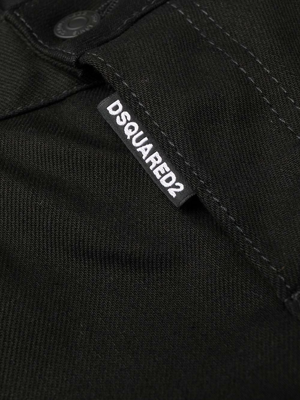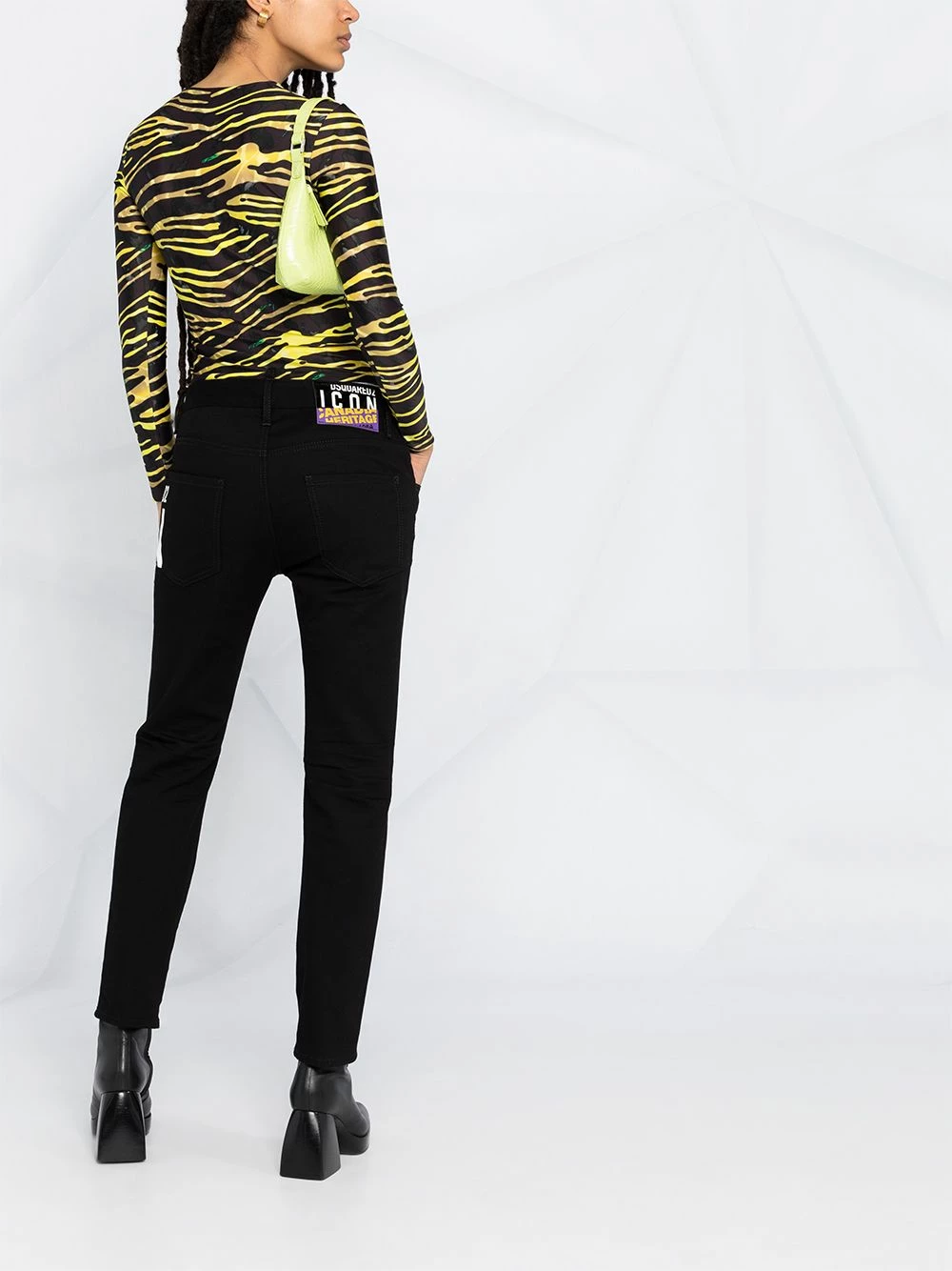 Slogan imprimé, détails de rivets, coupe ajustée, passants de ceinture, fermeture dissimulée sur le devant, 5 poches classiques. Couleur : noir.