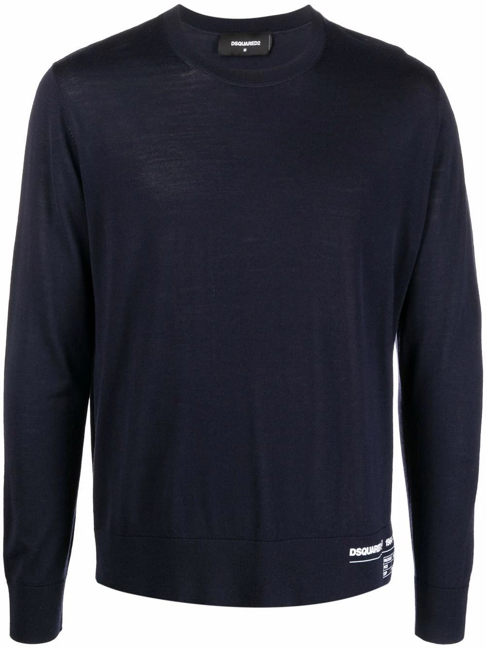 Maille nervurée, logo imprimé sur le côté, encolure ras du cou, manches longues, ourlet droit. Couleur : bleu. Matière : laine.