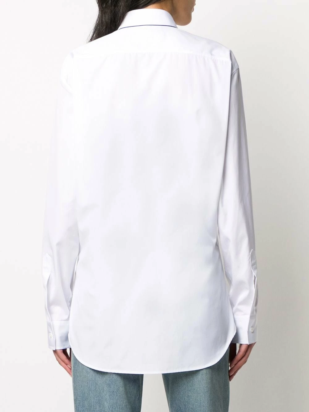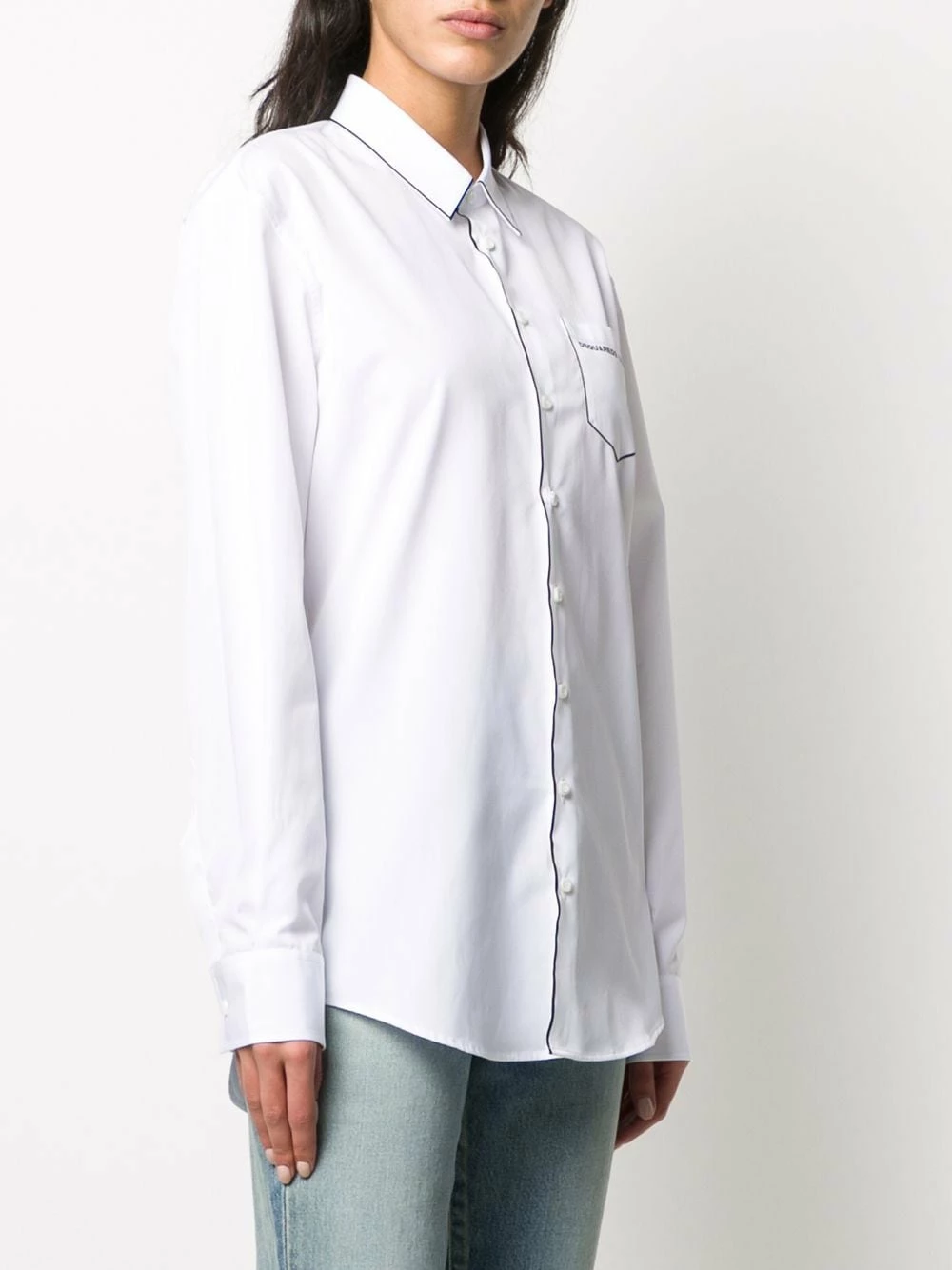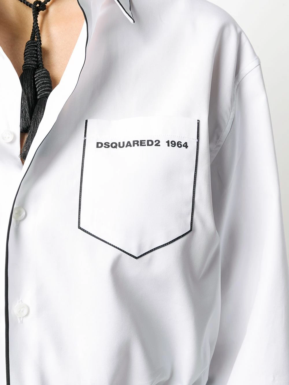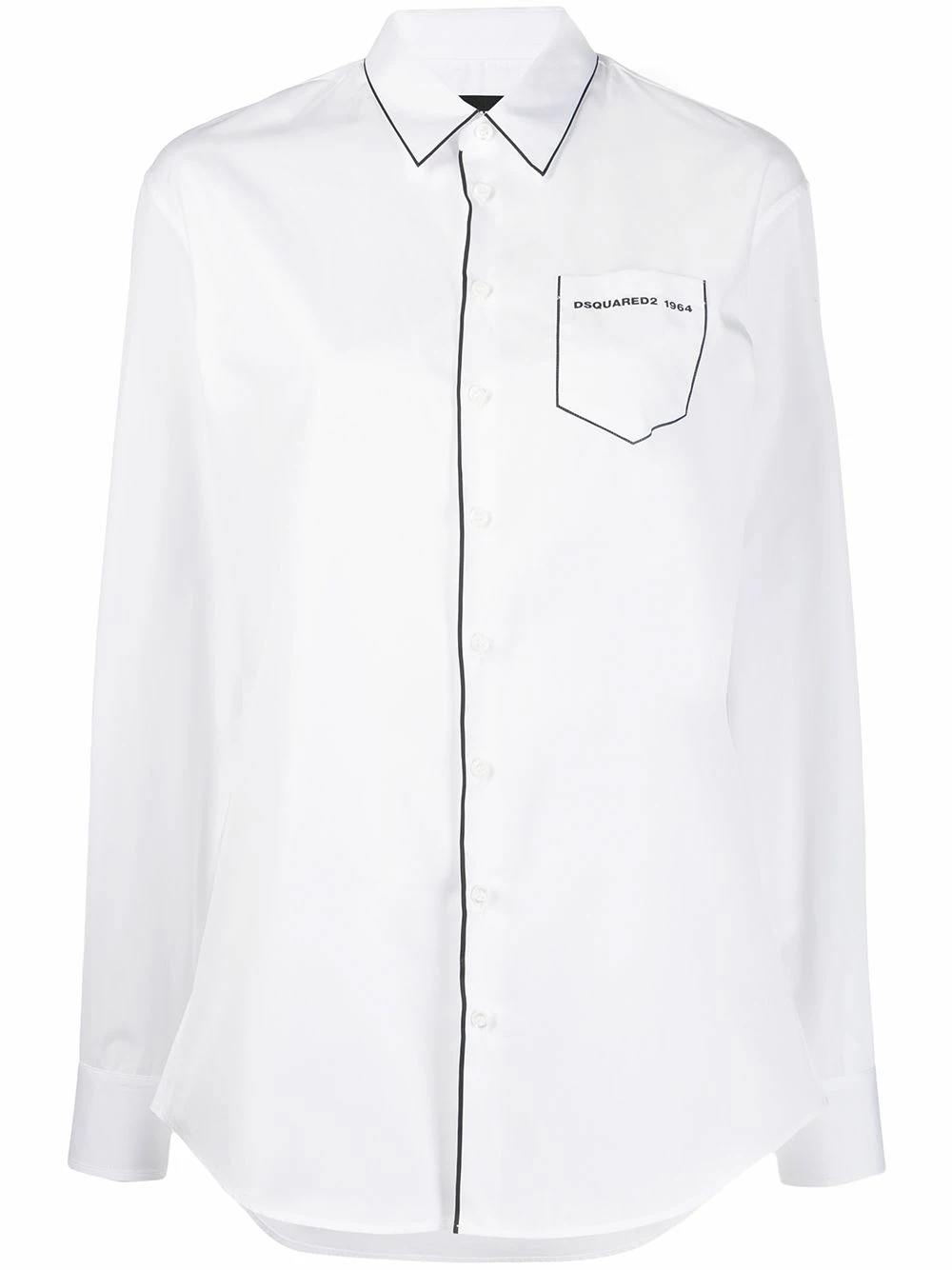 Blouse à liserés contrastants en coton Dsquared2 avec col pointu, boutonnière sur le devant, manches longues, poignets boutonnés et ourlet incurvé. Couleur : blanc.