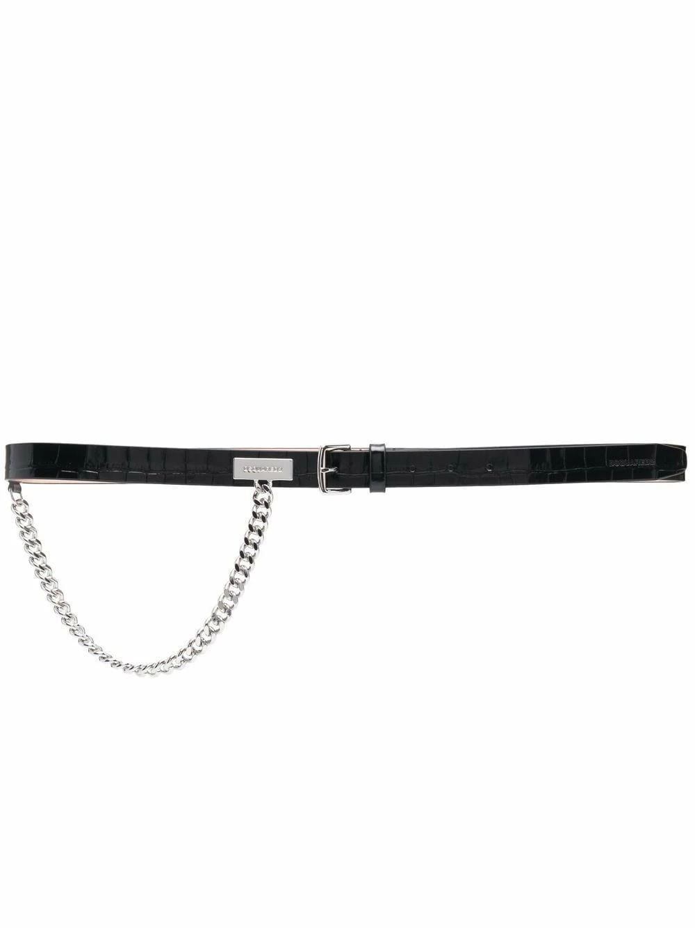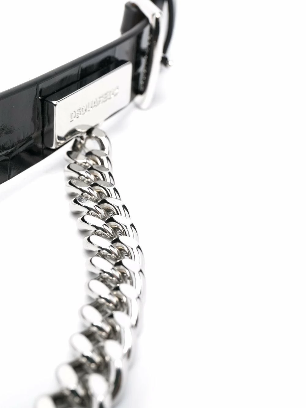 Effet peau de crocodile, détails de chaînes, ornements argentés, plaque logo argentée, fermeture à boucle. Couleur : noir. Matière : cuir.